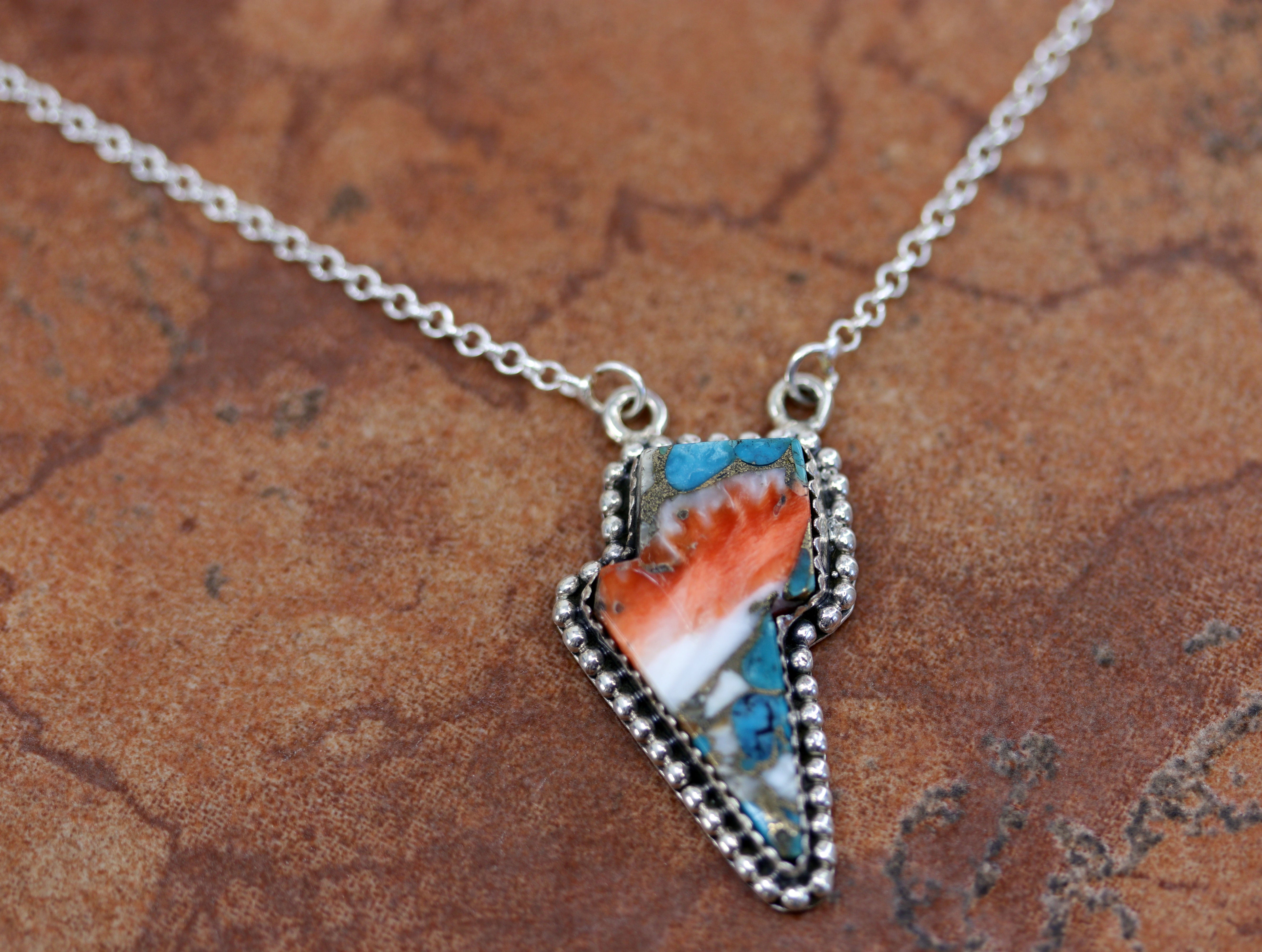 A beautiful lightning bolt. It is made from sterling silver and honey dahlia. The necklace is about 18" in length. The center pendant measures 2" in length by 1 3/8". This item is not Native American.