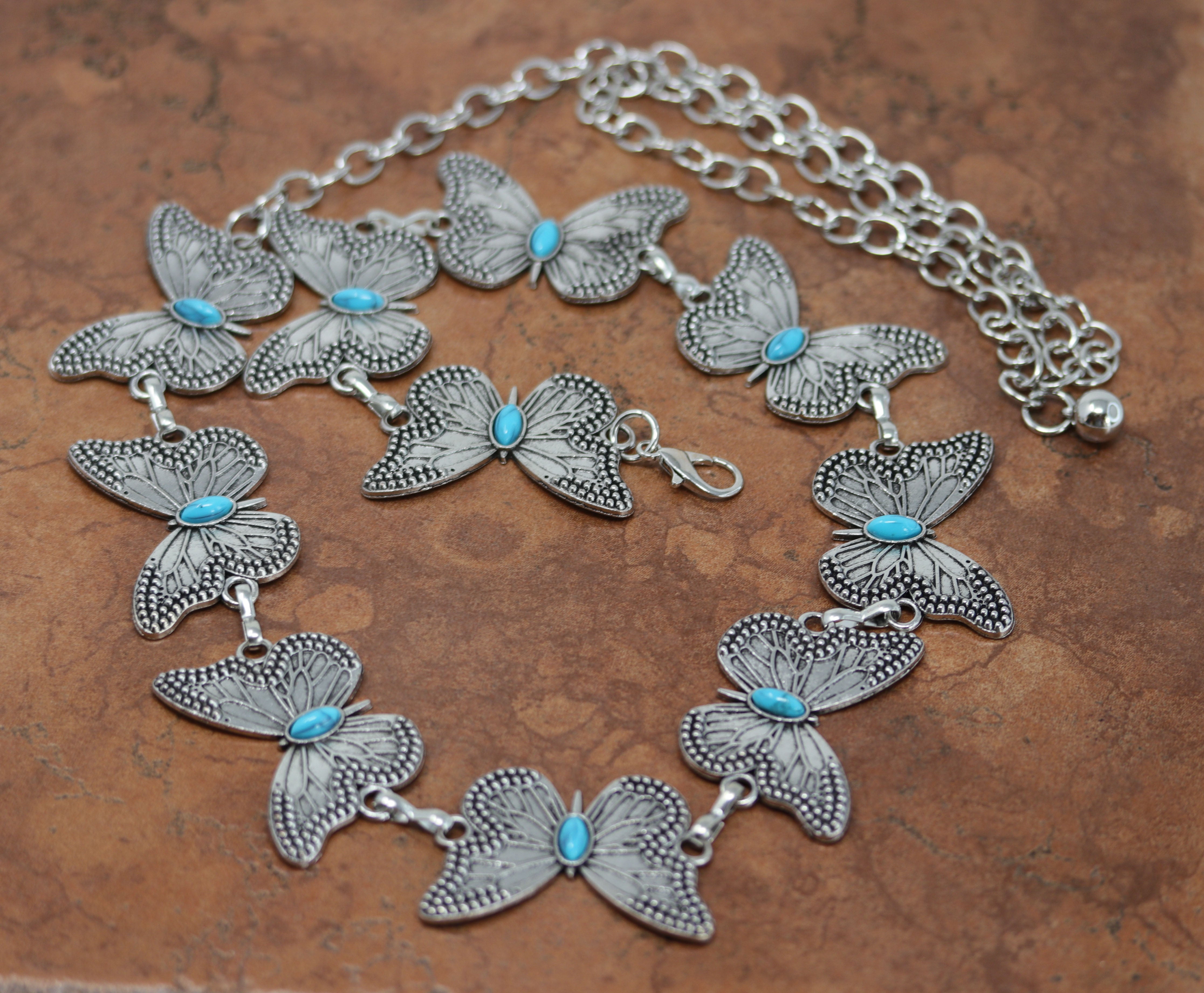 A beautiful fashion link belt made from zinc alloy and man made turquoise. The belt measures 44" in length and 1 1/2" in width (larger conchos). This item is not Native American.