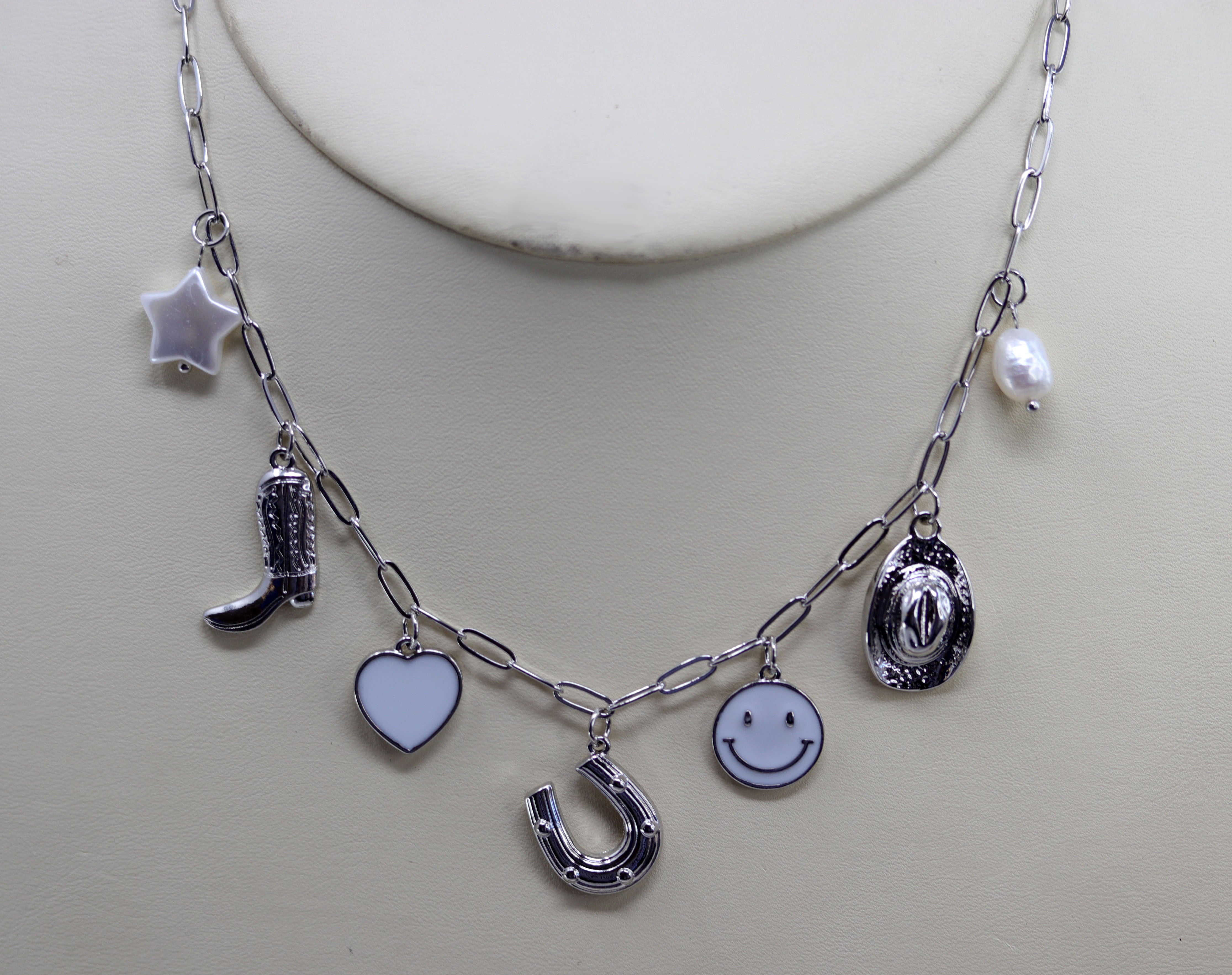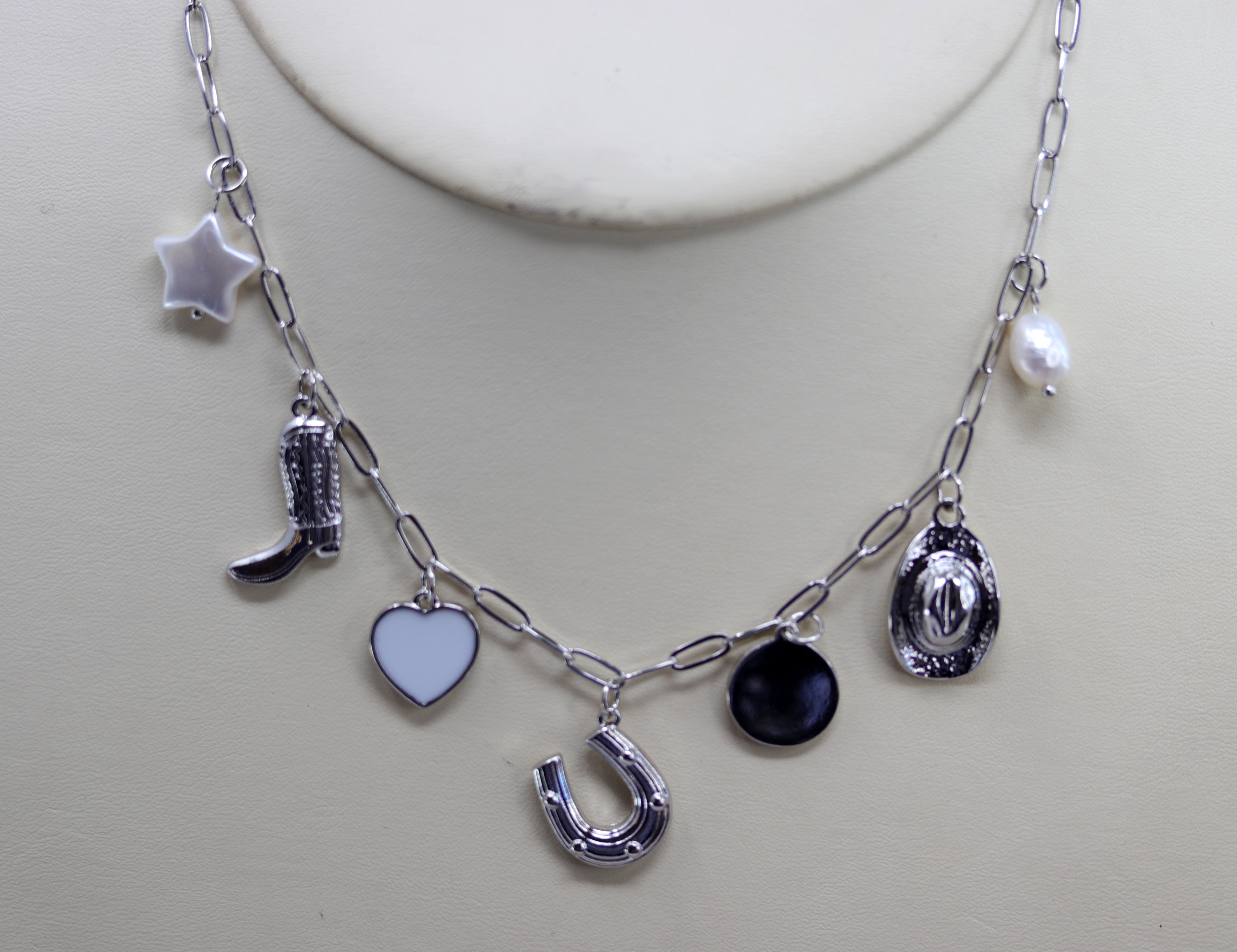 The necklace is about 18" in length plus the 3" extender. The center horse shoe pendant is 7/8" in length. It is made from zinc alloy and man made stones. This item is not Native American.