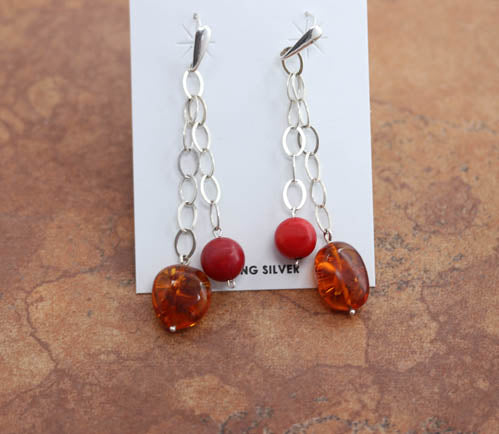 They are made from sterling silver and Baltic amber. The earrings are 3 1/4" in length including the hook, and 3/4" in width. This item is not Native American.