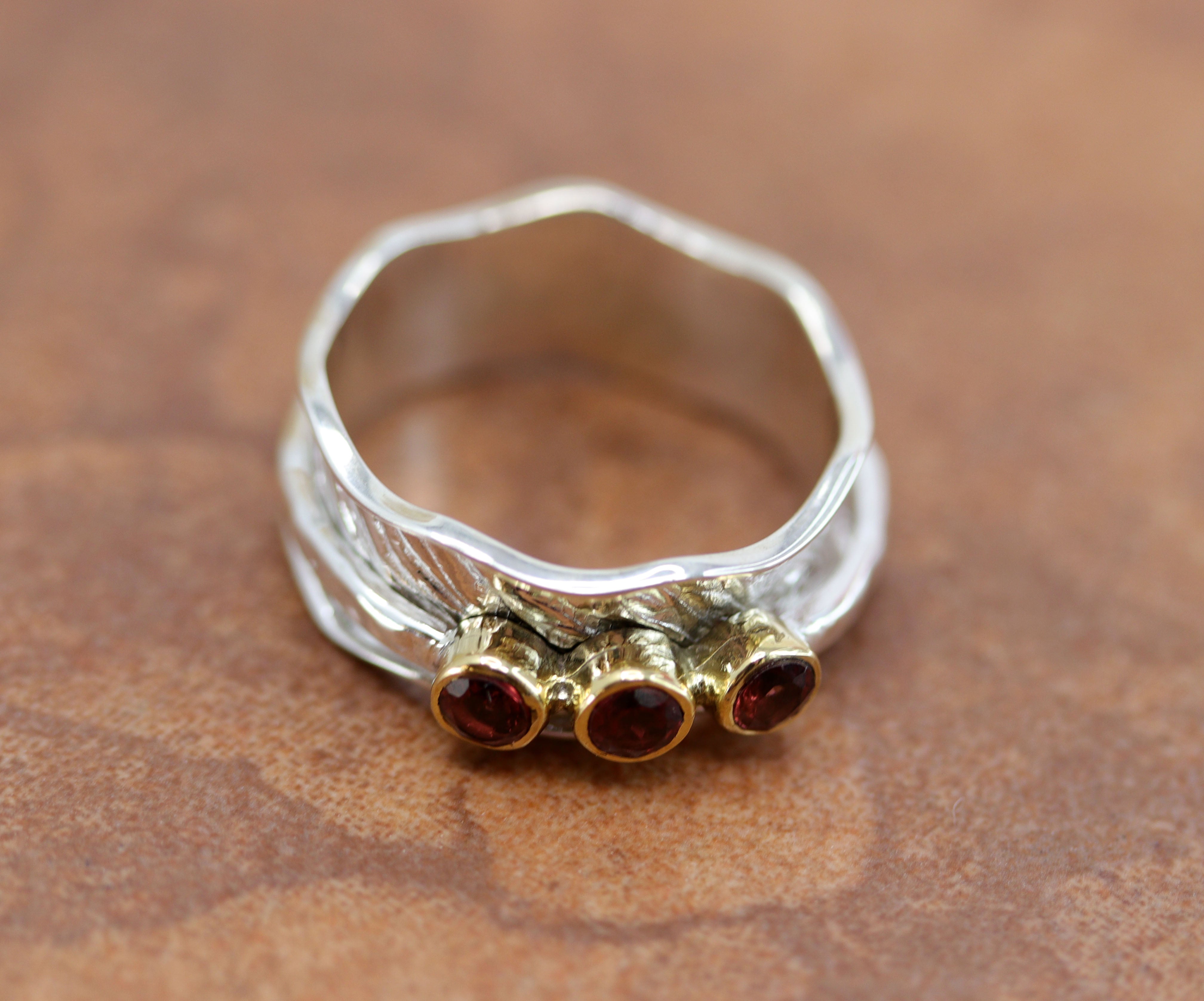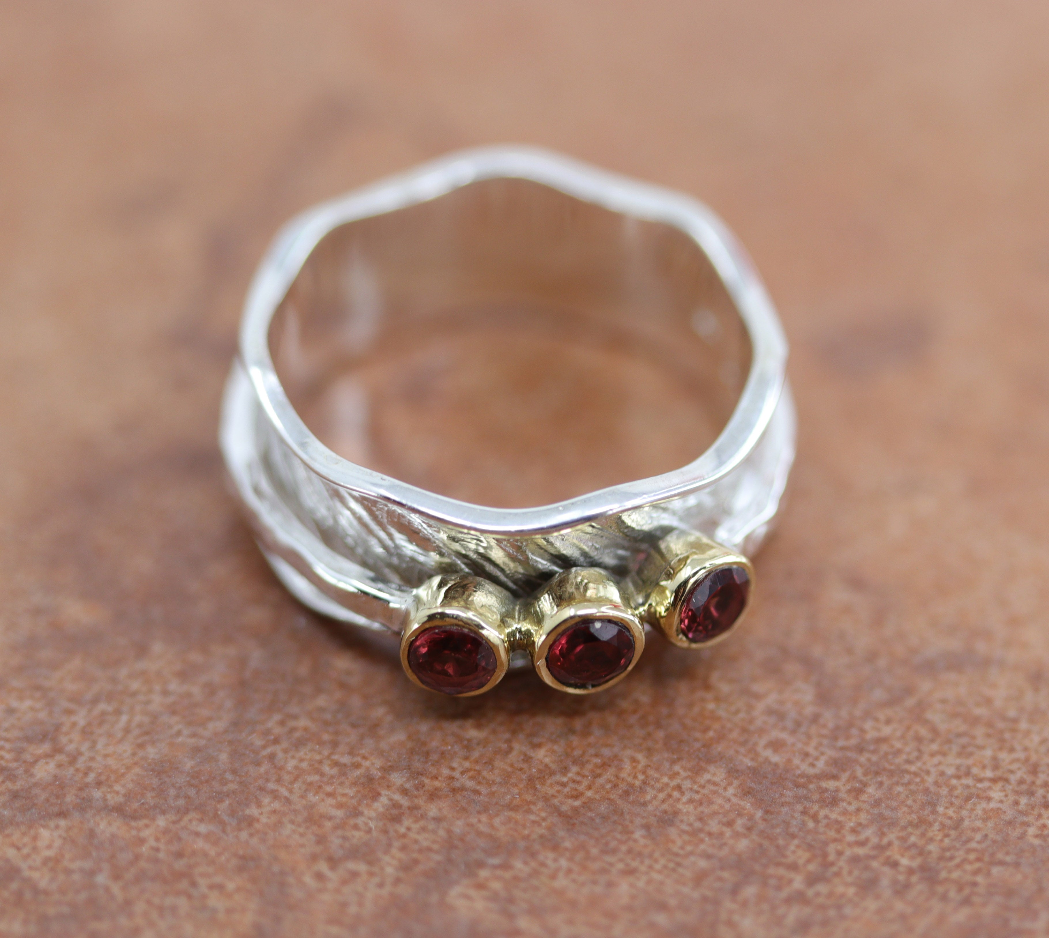 A beautiful Southwest Style spinner ring made from sterling silver, bronze, and garnet. The ring size is 6 1/2 and it is 1/4" in length. This item is not Native American.