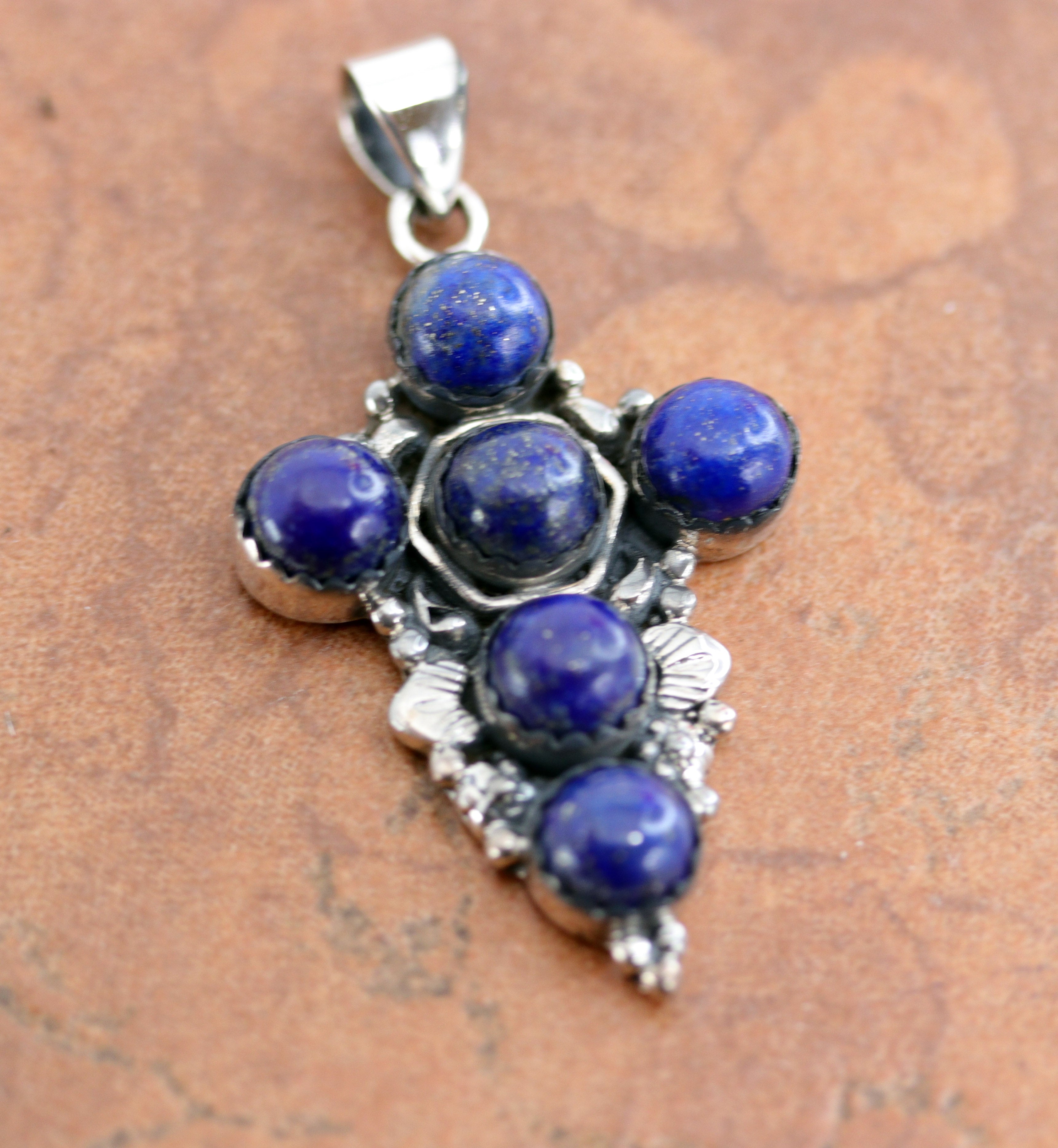 It is made from Sterling Silver and lapis. It is about 2" in length including the bail, and about 1 1/8" in width. This item is not Native American.