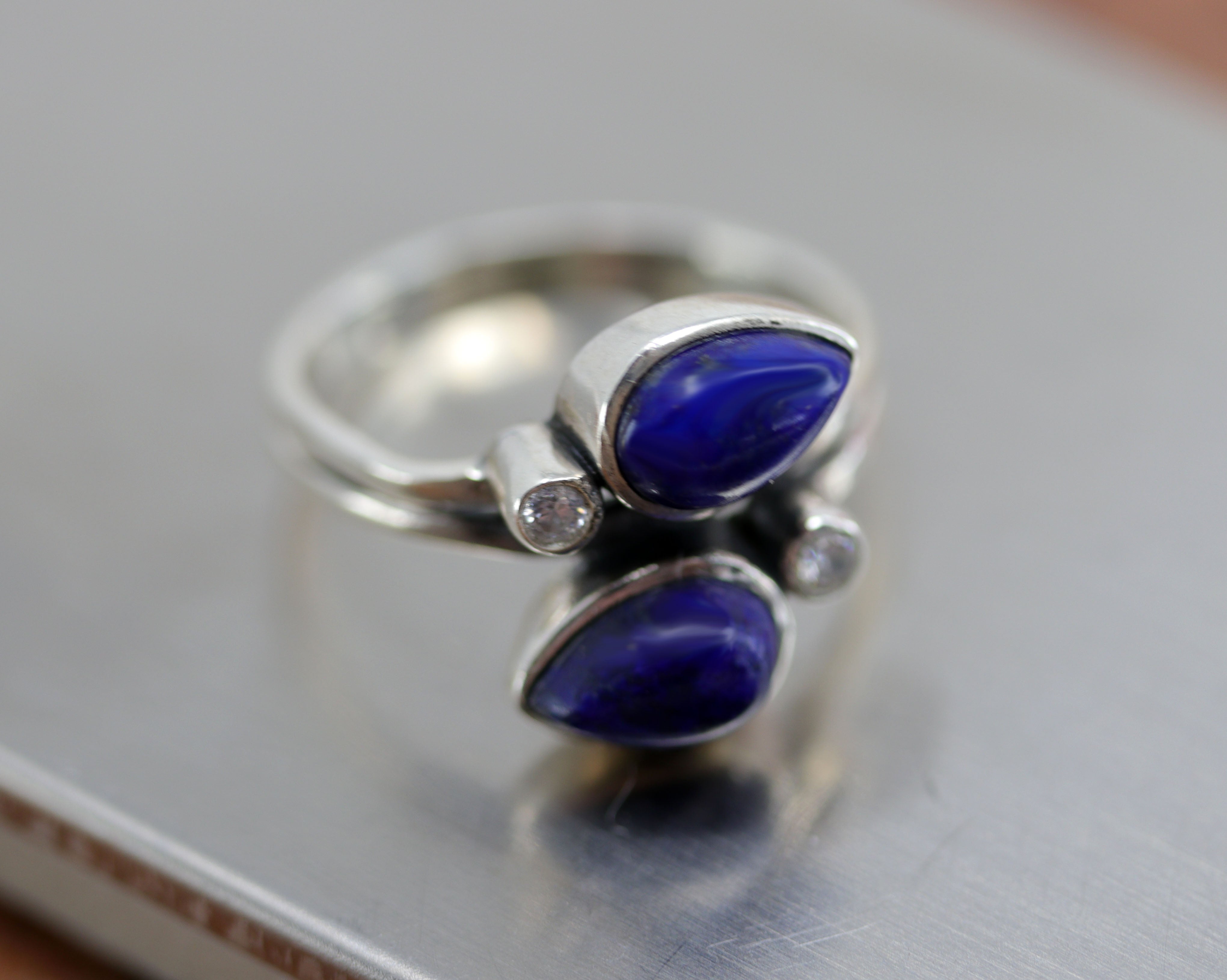 A beautiful Southwest Style gemstone ring made from sterling silver and lapis. The ring size is 6 1/2 and it is 5/8" in length. This item is not Native American.