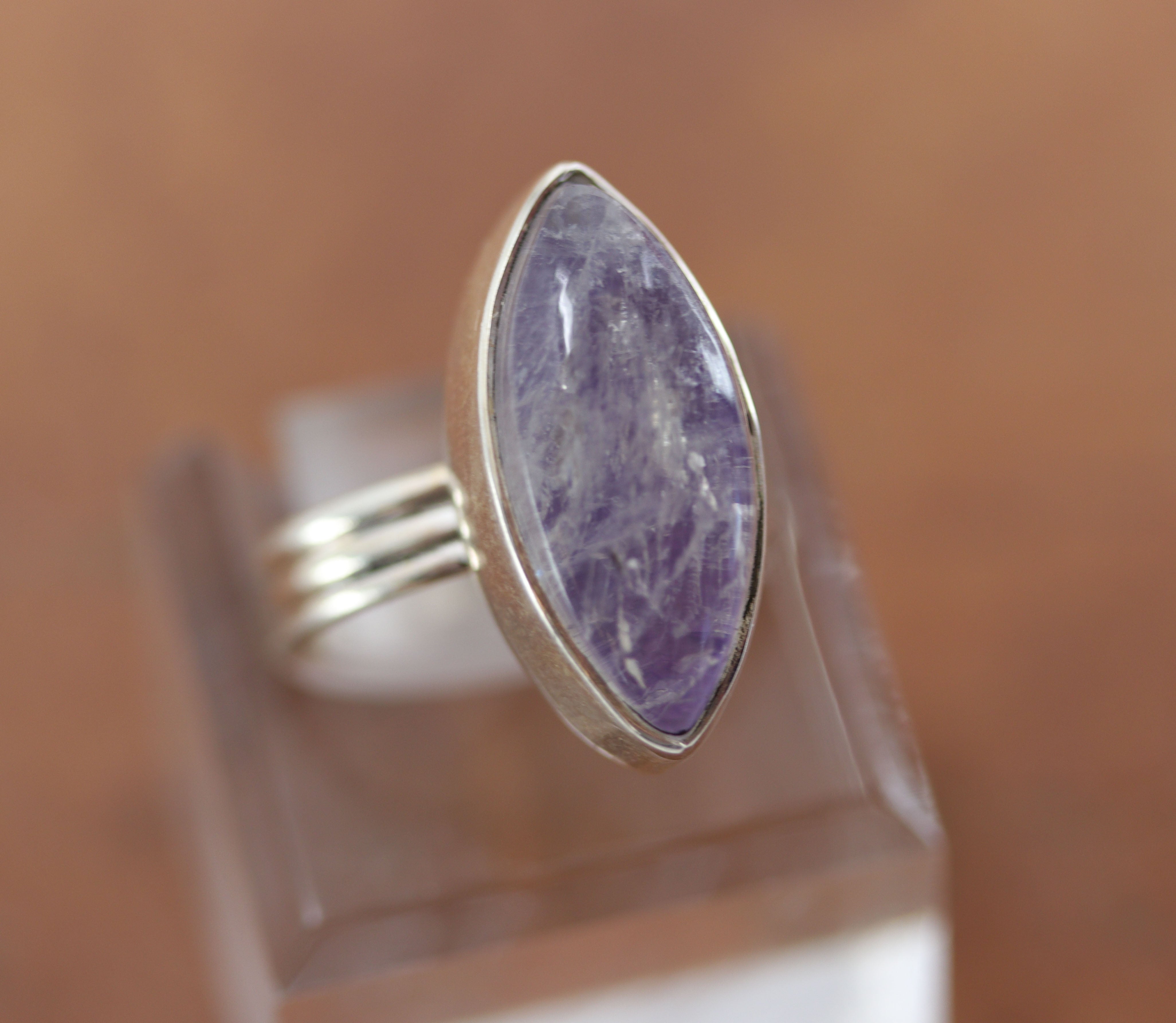 A beautiful Southwest Style gemstone ring made from sterling silver and lavender quartz. The ring size is 5 1/2 and it is 1" in length. This item is not Native American.