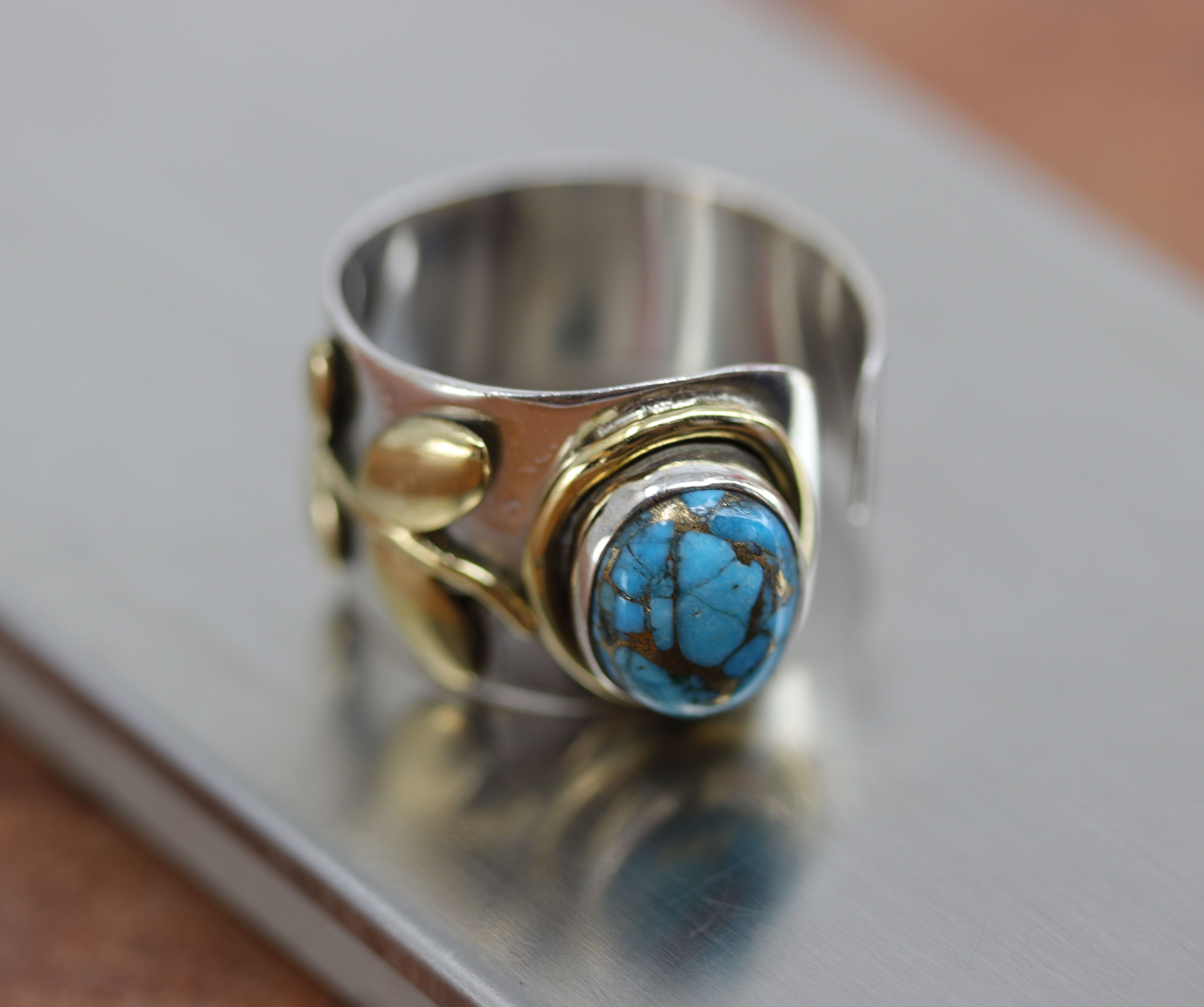 A beautiful Southwest Style spinner ring made from sterling silver, bronze, and mojave turquoise. The ring size is adjustable and fits sizes 7 to 9 and it is 5/8" in length. This item is not Native American.