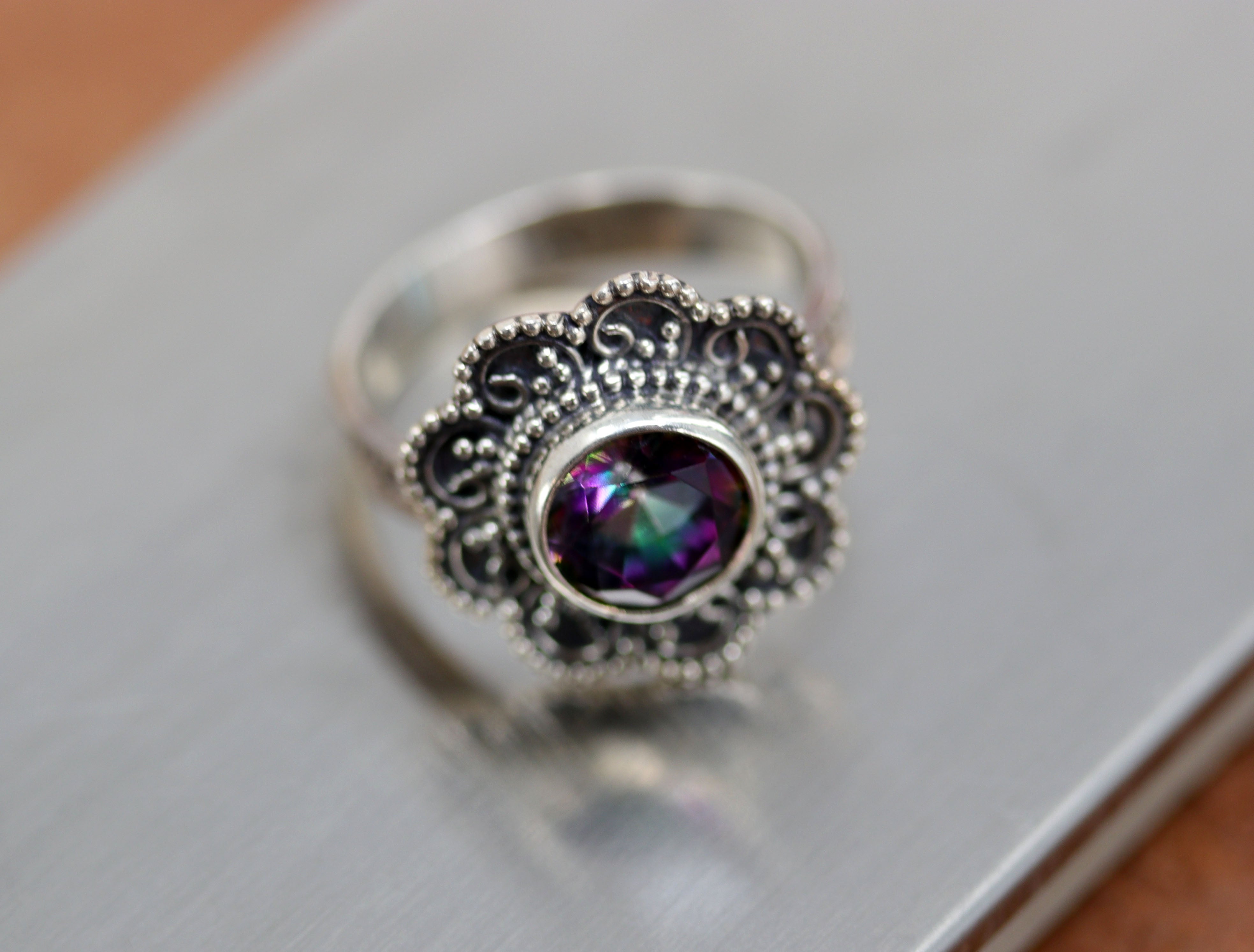 A beautiful Southwest Style gemstone ring made from sterling silver and mystic topaz. The ring size is 6 and it is about 7/8" in length. This item is not Native American.