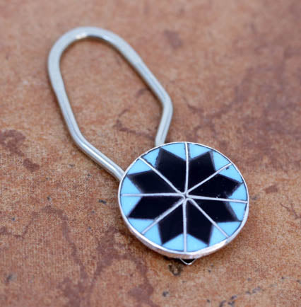 Zuni Native American key chain. It is made from sterling silver and multi-stone inlay. It is about 2 3/8" in length and 1" wide. It is signed by the maker.