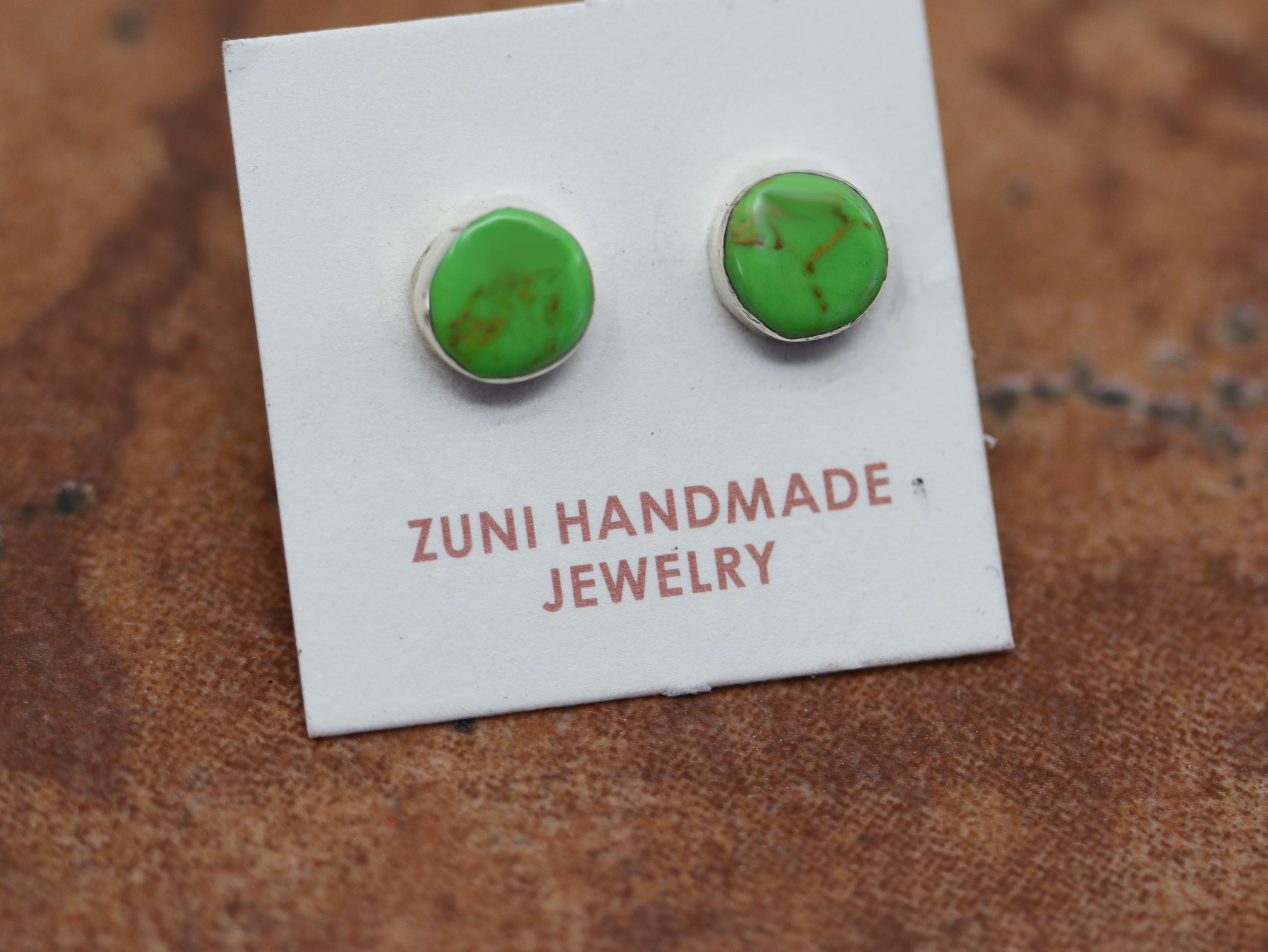 They are made from sterling silver and gaspeite. The earrings are about 1/4" in diameter.
