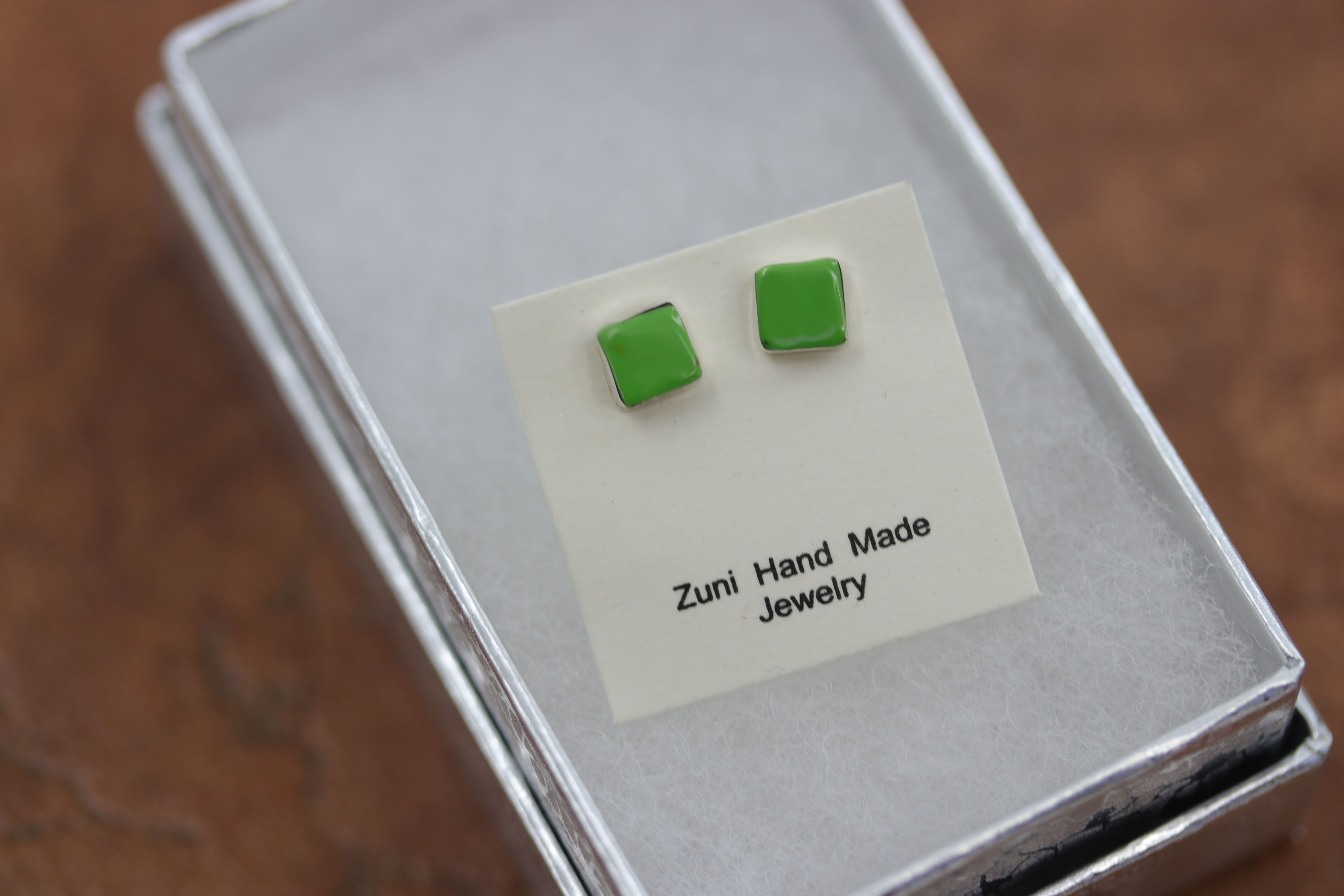 They are made from sterling silver and gaspeite. The earrings are about 1/4" in length.