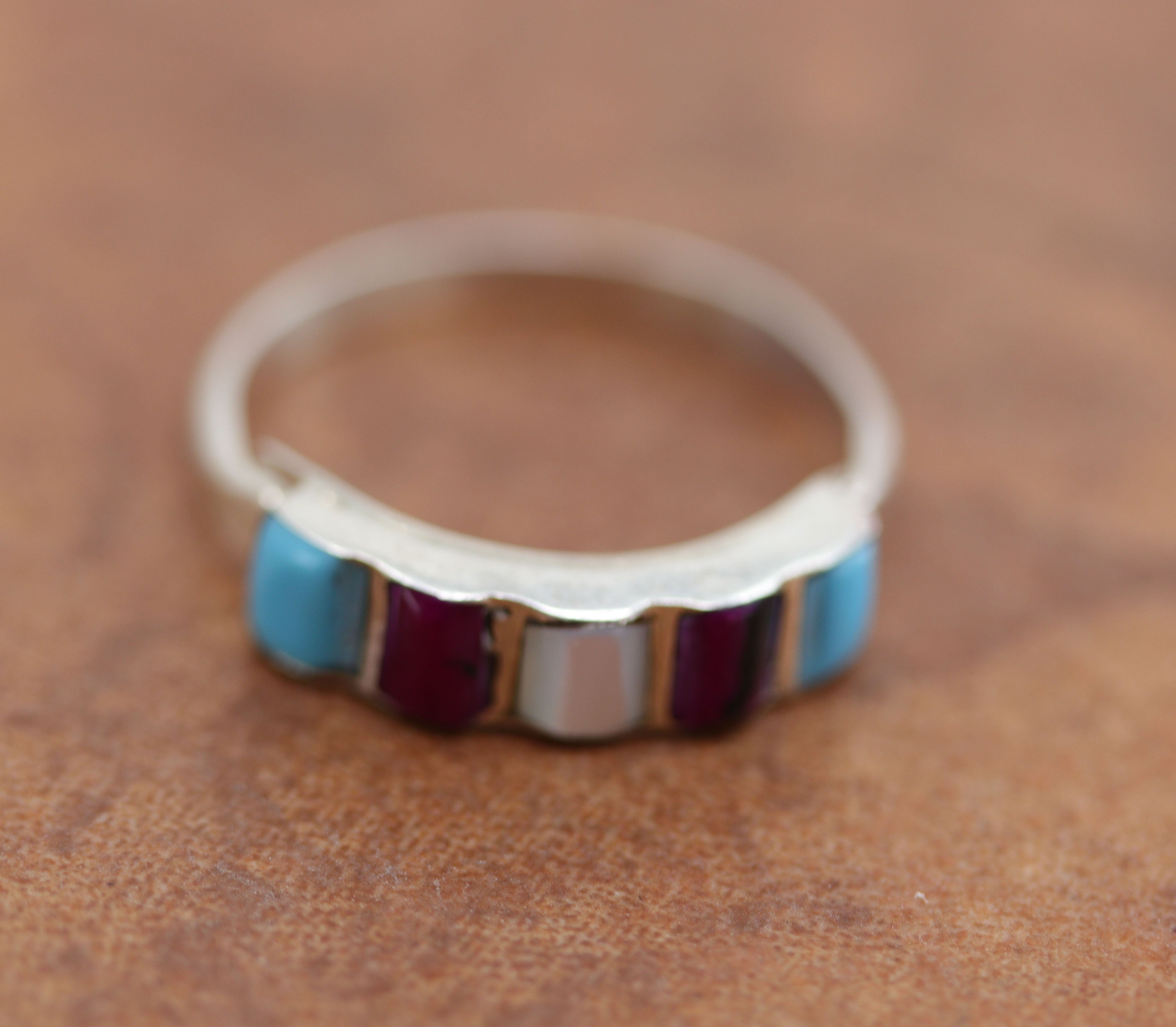 Lovely Zuni Native American ring. It is made from sterling silver and multi-stone inlay. The ring size 7 and it is 3/16" in length.