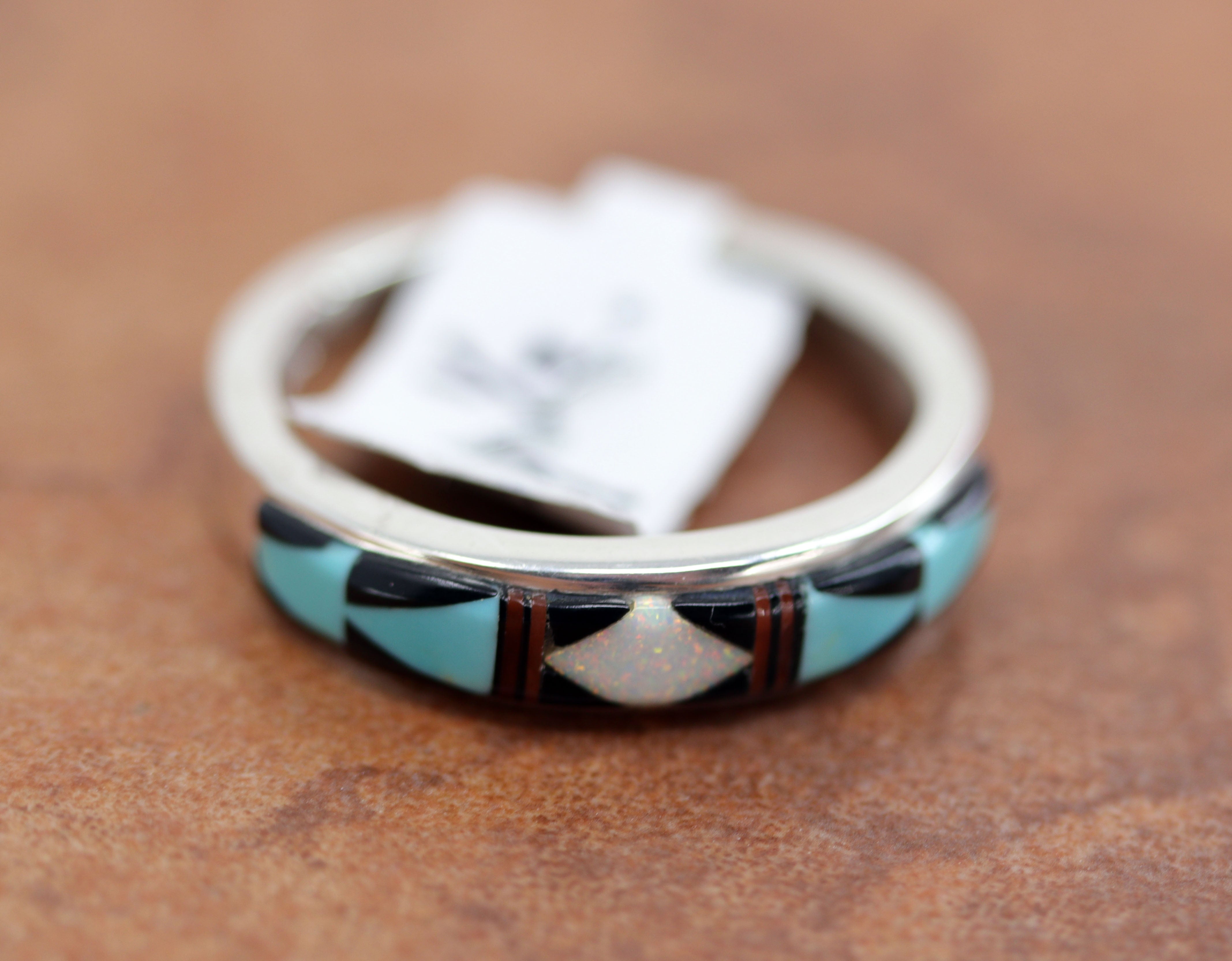 Lovely Zuni Native American ring. It is made from sterling silver and multi-stone inlay. The ring size 9 1/2 and it is 3/16" in length.
