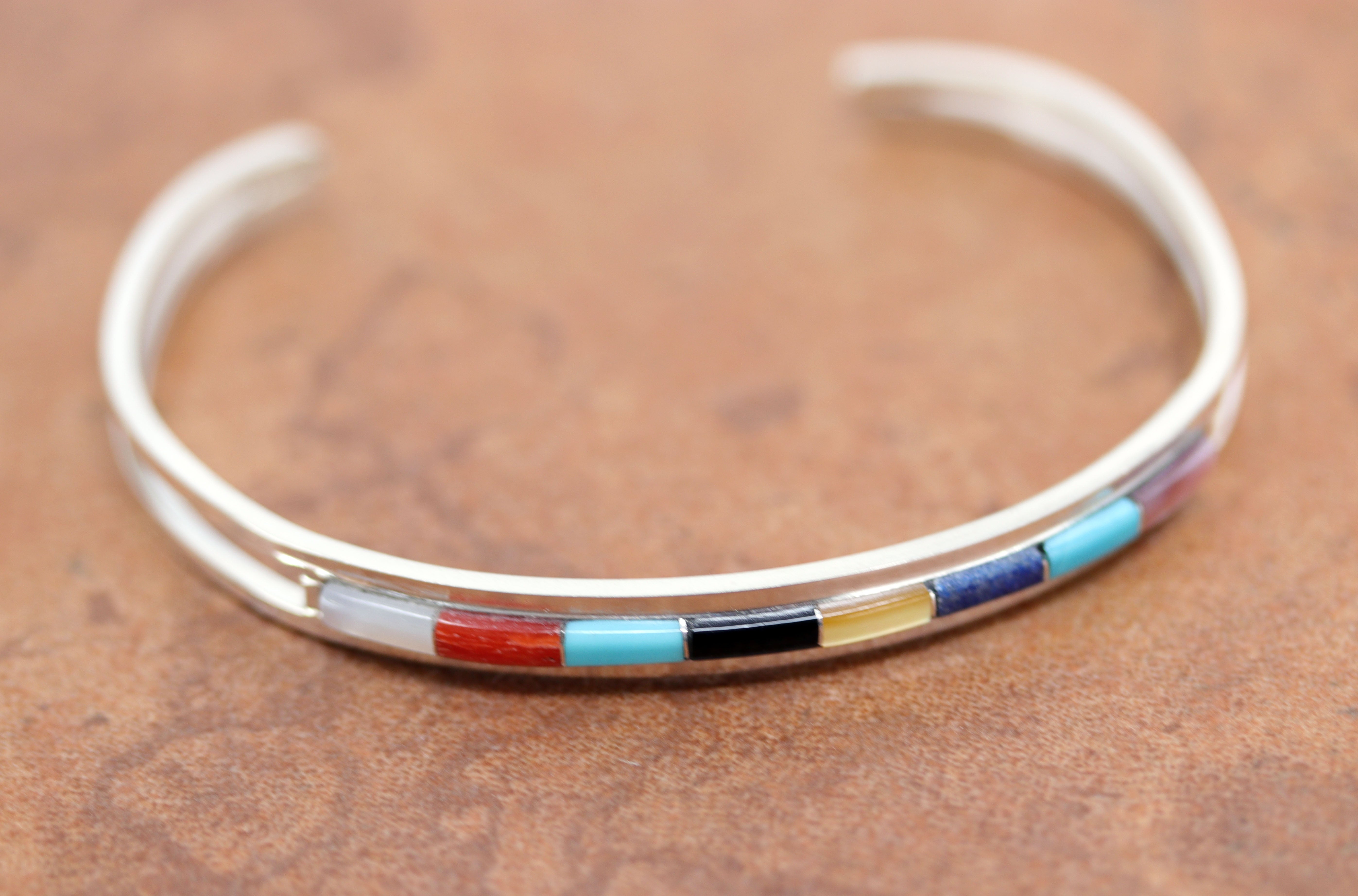 A brand new, very nice, authentic Zuni Native American bracelet by Wallace. It is made from sterling silver and multi-stone inlay. It is about 5 1/2" around and about 1/4" wide at the widest point. The opening is about 1 1/2" and partly flexible.