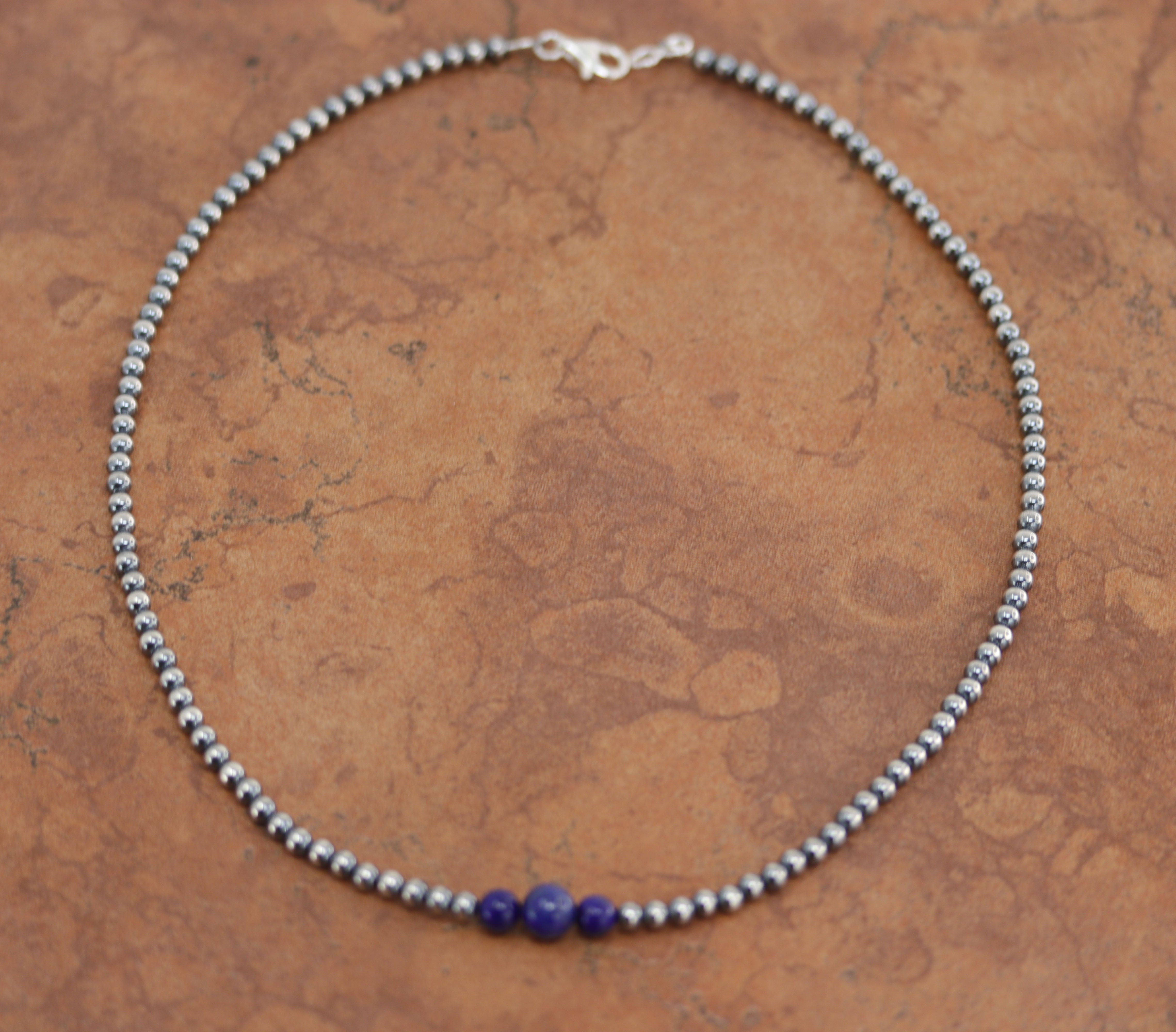A beautiful silver Cowgirl Desert Pearl necklace with lapis. The necklace is 20" in length and the beads measure 4 mm. This item is not Native American.