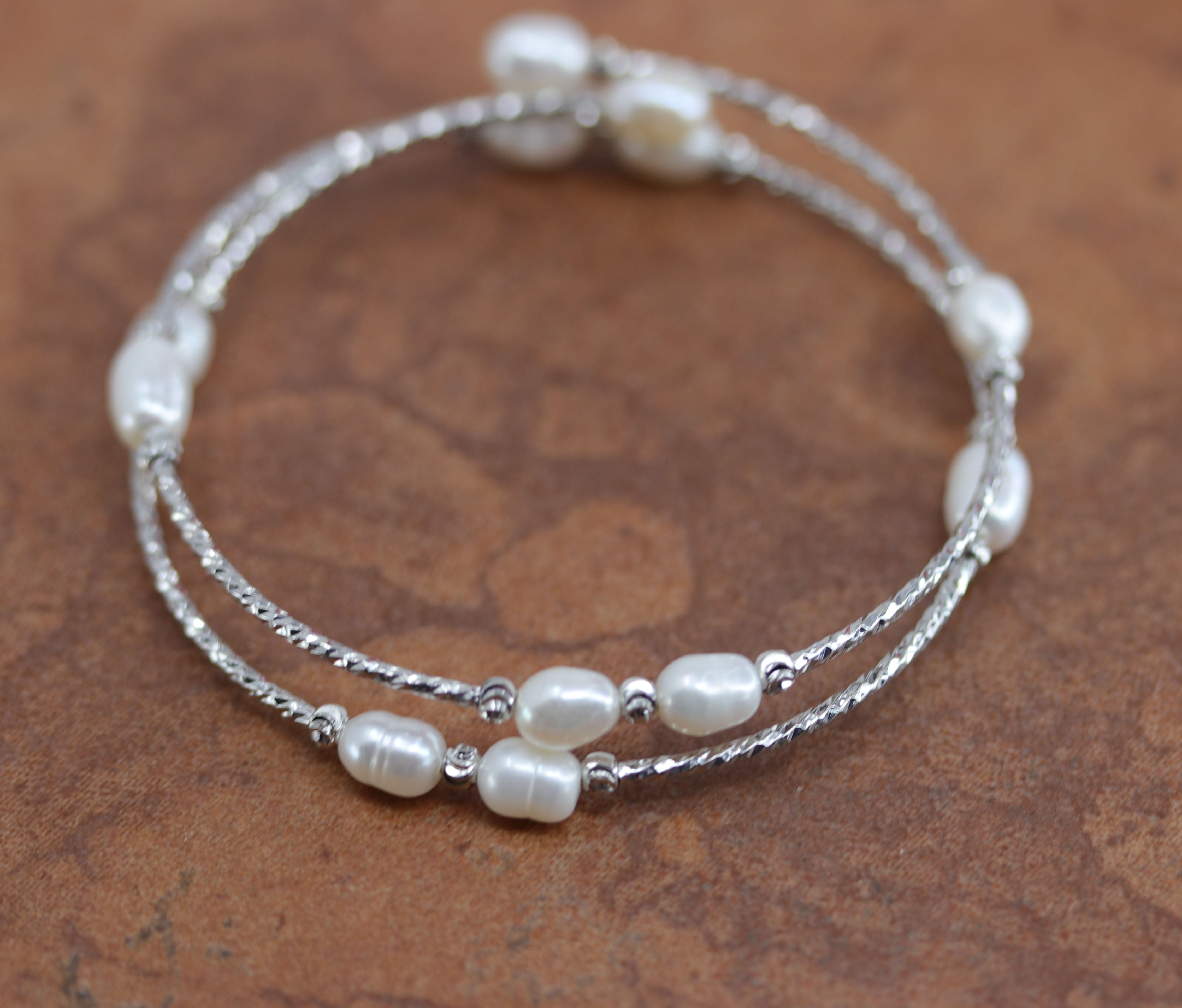 Lovely bracelet made from white rice pearls and rhodium over copper. The bracelet is very adjustable and will fit most adult sizes and the width of the widest part is 1/4". This item is not Native American.