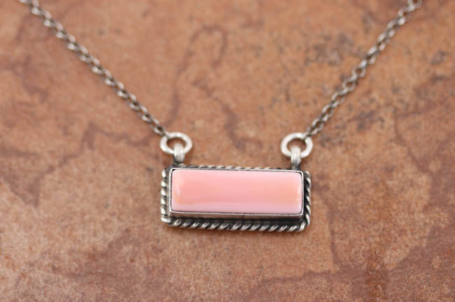 A beautiful Navajo Native American necklace by Eloise Kee. It is made from sterling silver and pink conch shell. The necklace is about 17" in length. The center pendant measures 1 1/8" by 1/2".
