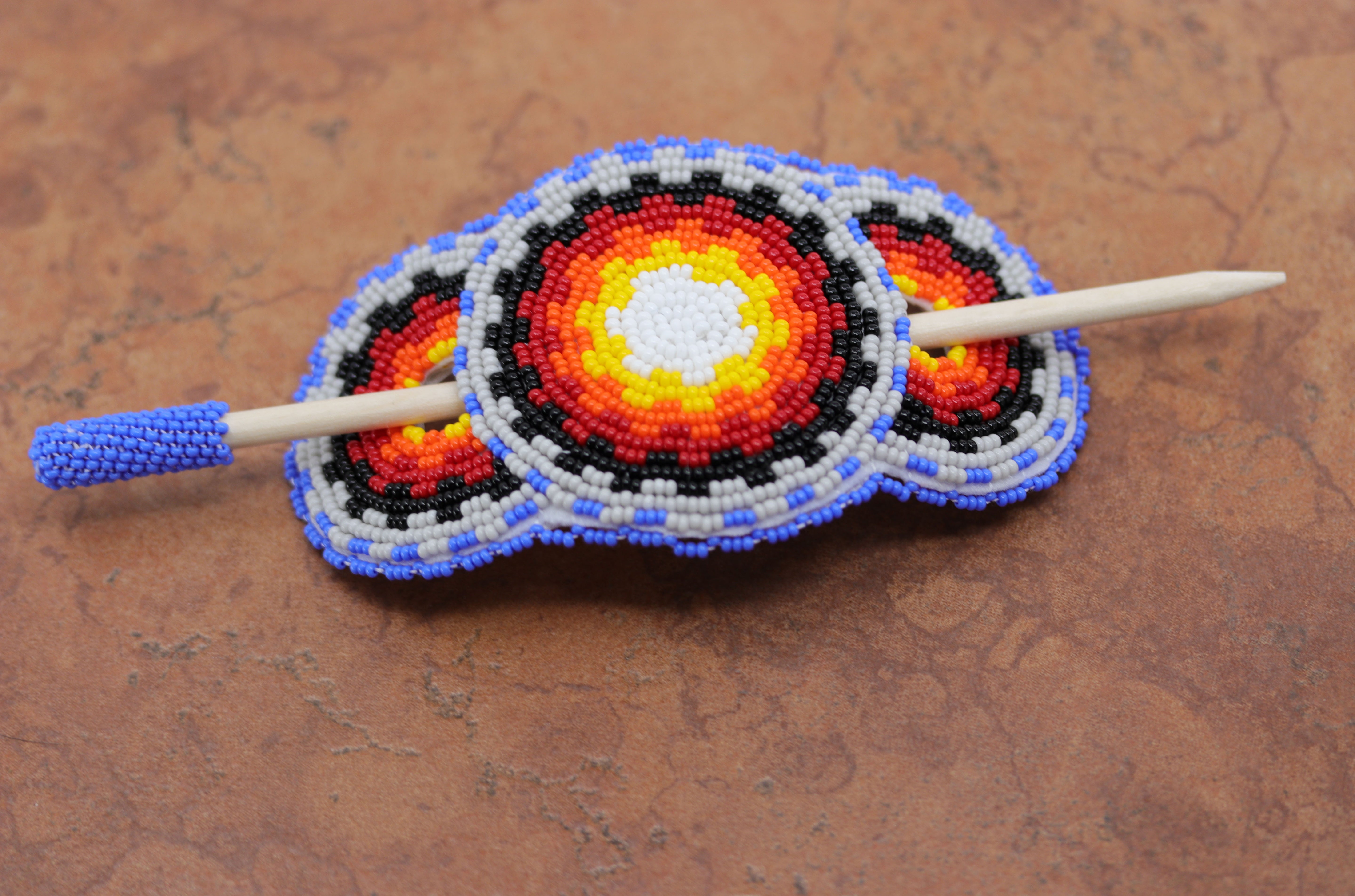 Beautiful Navajo Native American Beaded Hair Barrette. It is 2 7/8" long, and about 4 1/2" wide. The stick measures 7 1/4" in length.