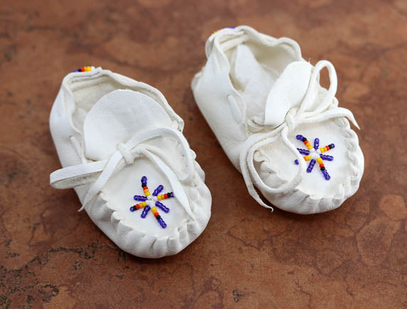 Navajo Native American leather moccasins. They measure 3 3/4" long by about 2" wide on the outside.