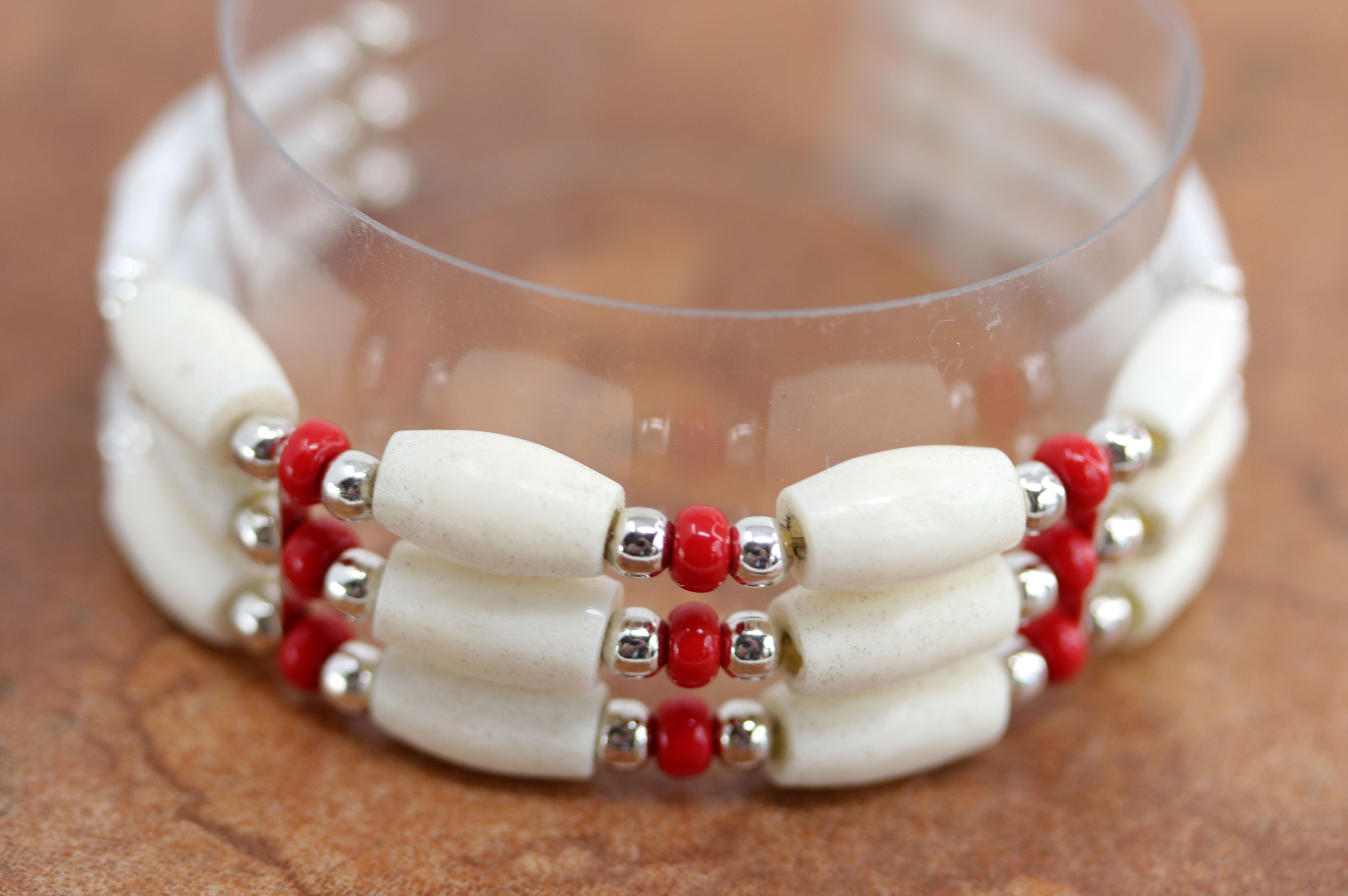 A beautiful Navajo Native American beaded bracelet. It is about 5 1/2" from end to end and the width is 7/8". The bracelet is very flexible so it will fit many different sizes.