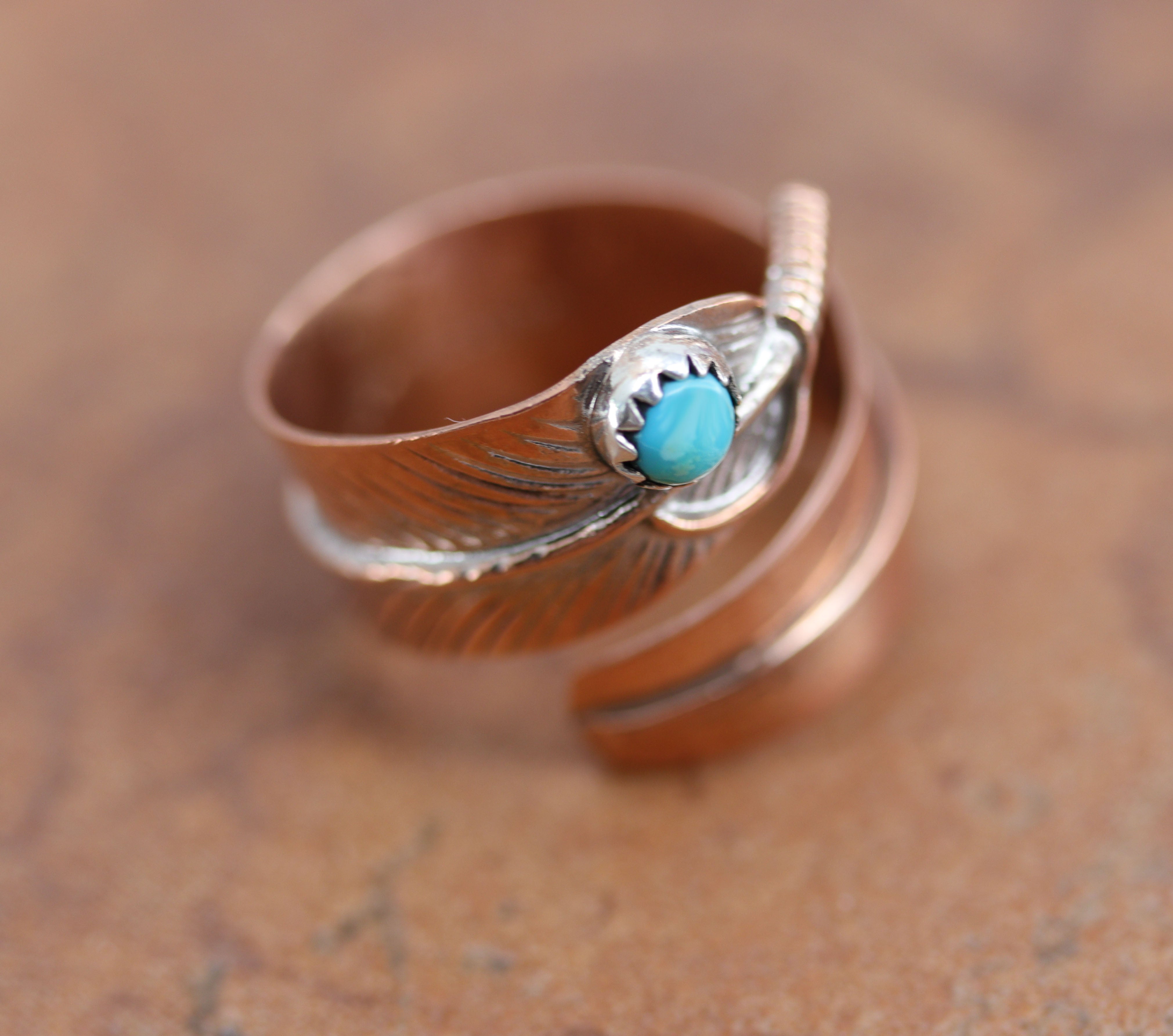 Navajo Copper Turquoise Feather Ring Size 6-8