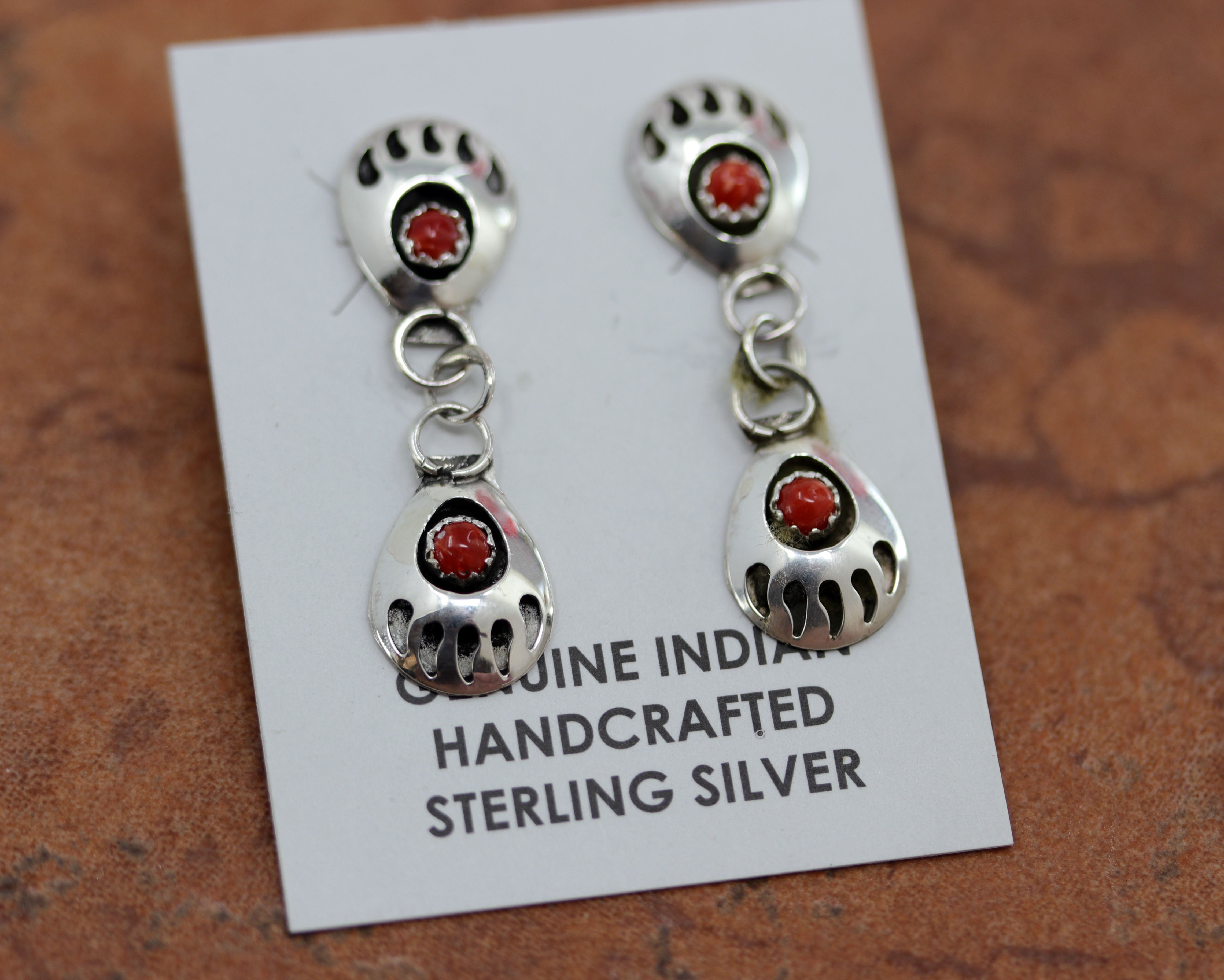 Navajo Native American Bear Paw post earrings. They are made from sterling silver and coral. The earrings are about 1 3/8" in length and 1/2" wide.