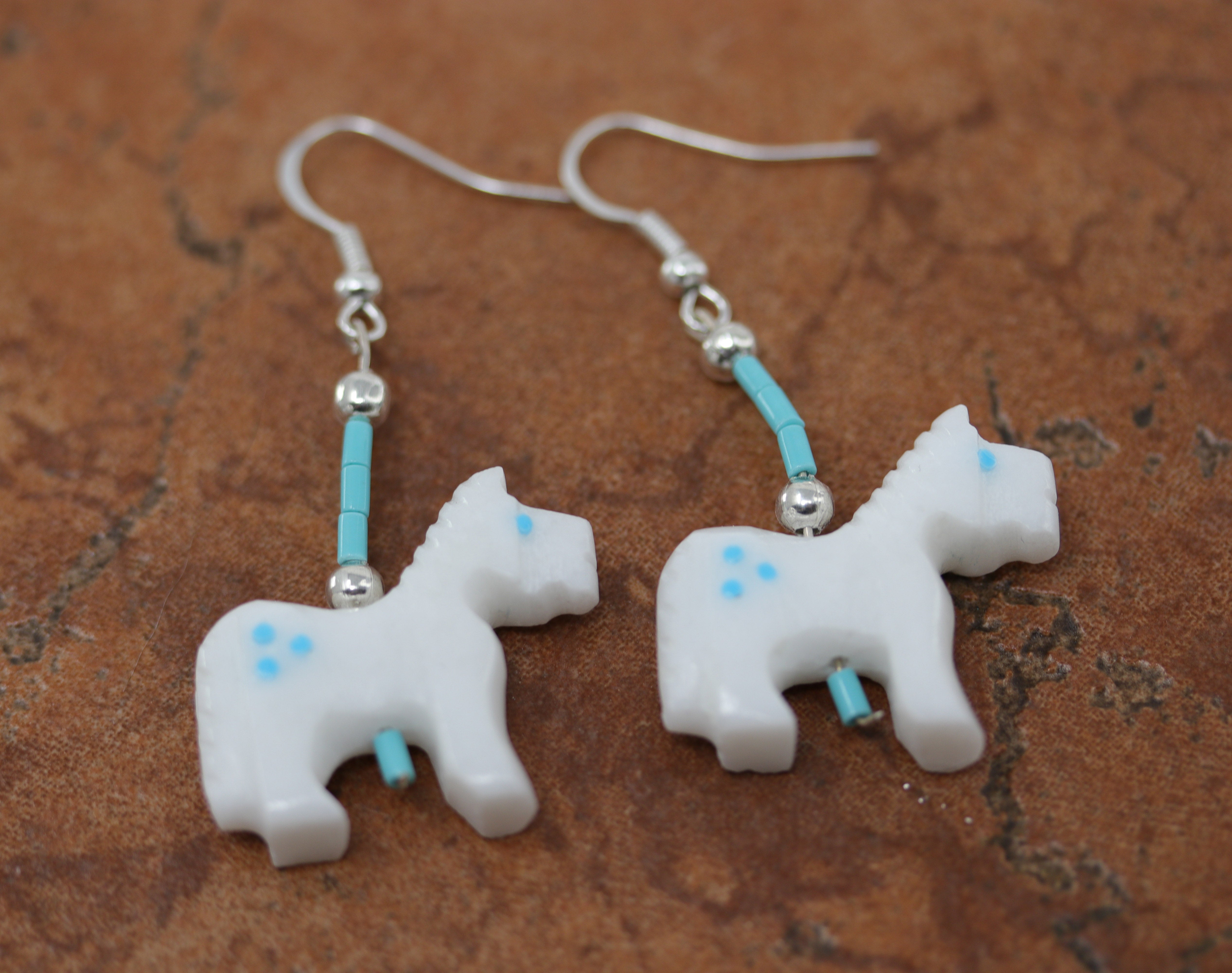 Beautiful Navajo Horse Fetish Earrings by Todd Etsate. They are made from sterling silver and heishi. The earrings about 2 1/8" long including the hook and 1 1/4" in width.