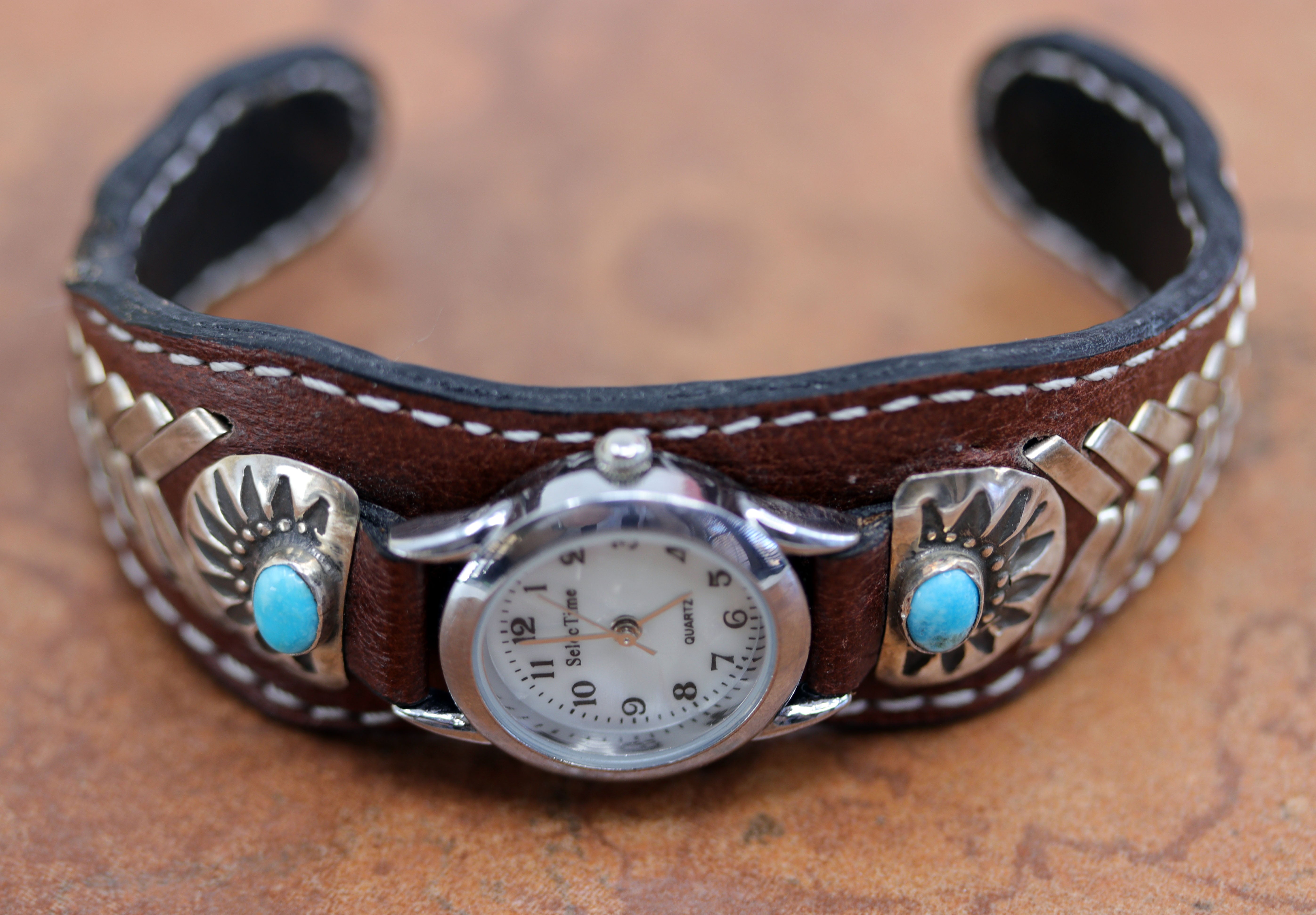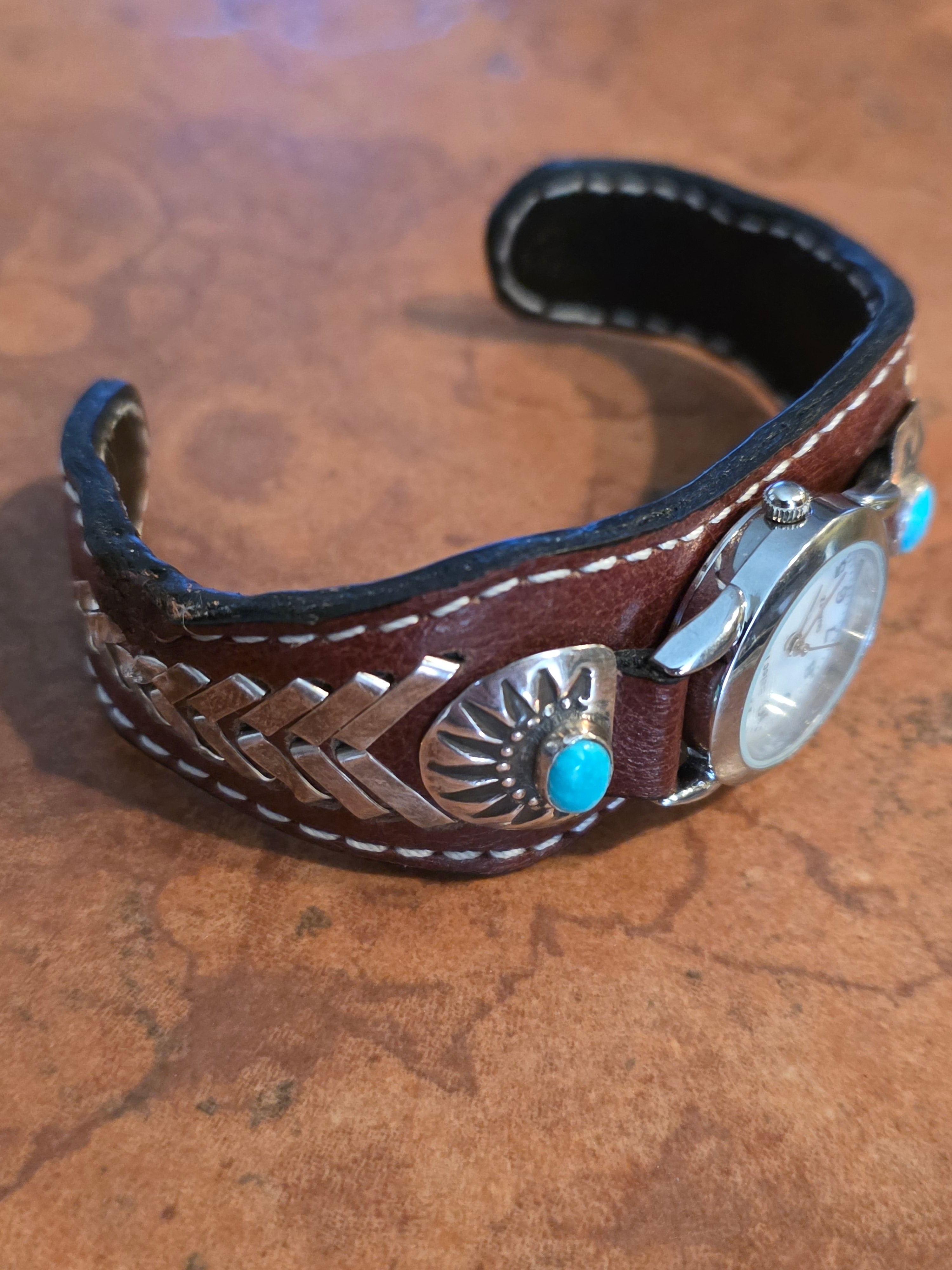 A beautiful Navajo Native American watch. This watch is used and has some wear and tear on the side. Please check the photos before purchasing. It is made from sterling silver, turquoise, and leather. The watch bracelet is 5 3/4" around and about 1 1/8" in width. The opening is 1" and partly flexible.