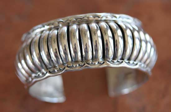 Navajo Native American bracelet. It is made from sterling silver. It is about 6" around and about 1 1/8" wide at the widest point. It is stamped Navajo and Sterling. The opening is about 1", and partly flexible.