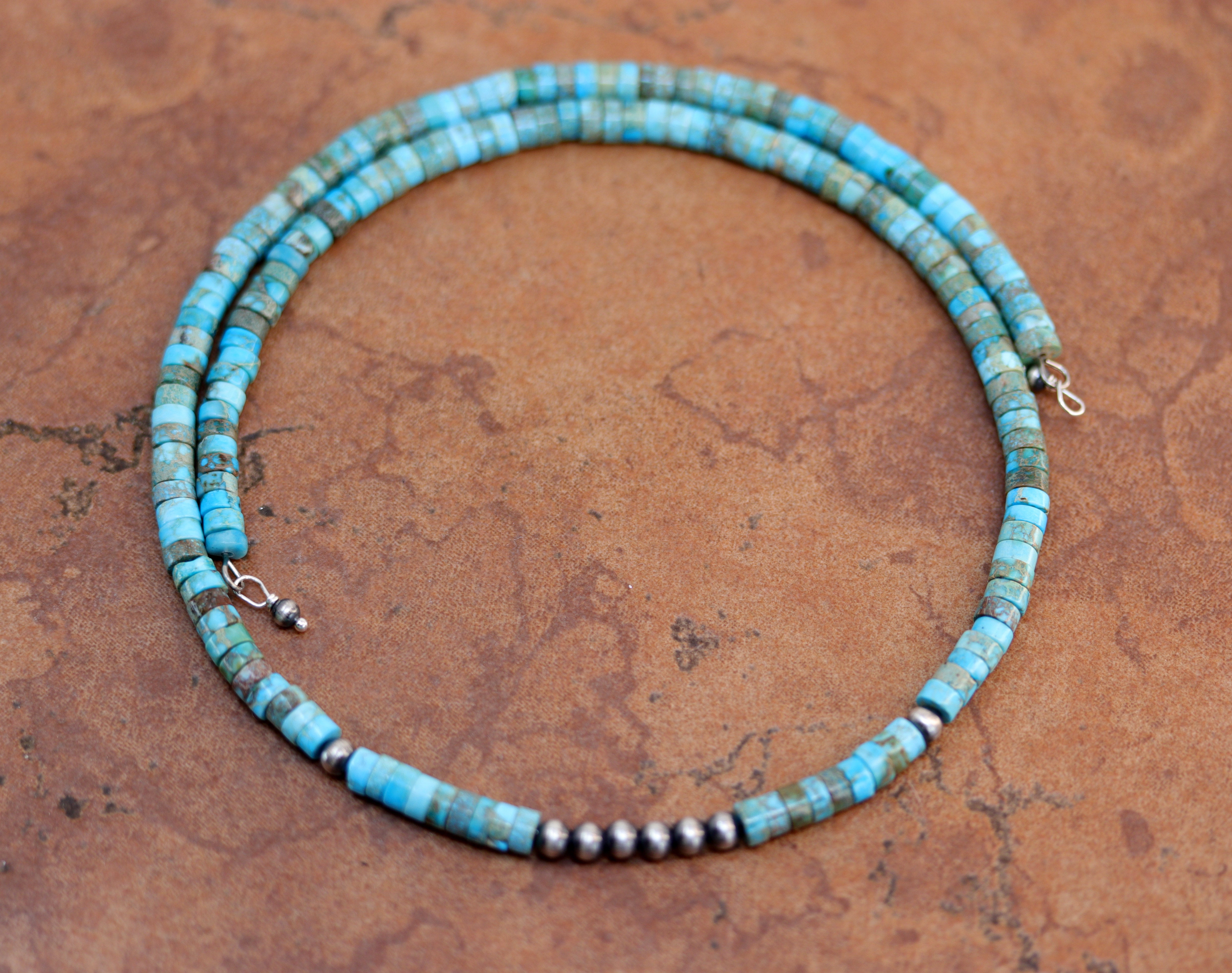 A beautiful silver Navajo Pearl Native American choker necklace. The necklace is 16" in length and the beads measure 1/4" wide.