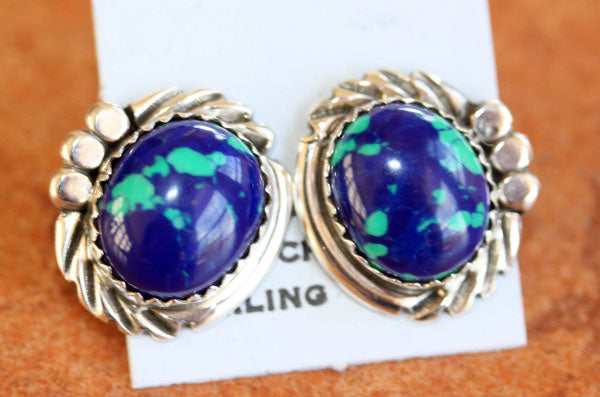 Very nice, Navajo Native American earrings. They are made from sterling silver and azurite malachite. The earrings are about 5/8" in length, and about 5/8" wide. They are stamped sterling. Azurite Malachite is believed to be a powerful meditation stone.