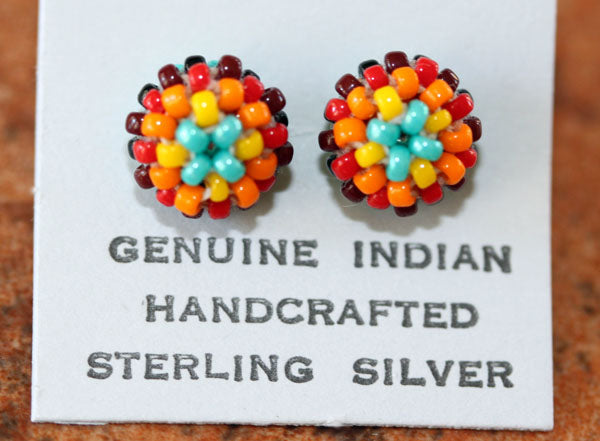 Navajo Native American earrings. They are made from sterling silver and multi-colored beads. The earrings about 3/8" in diameter.
