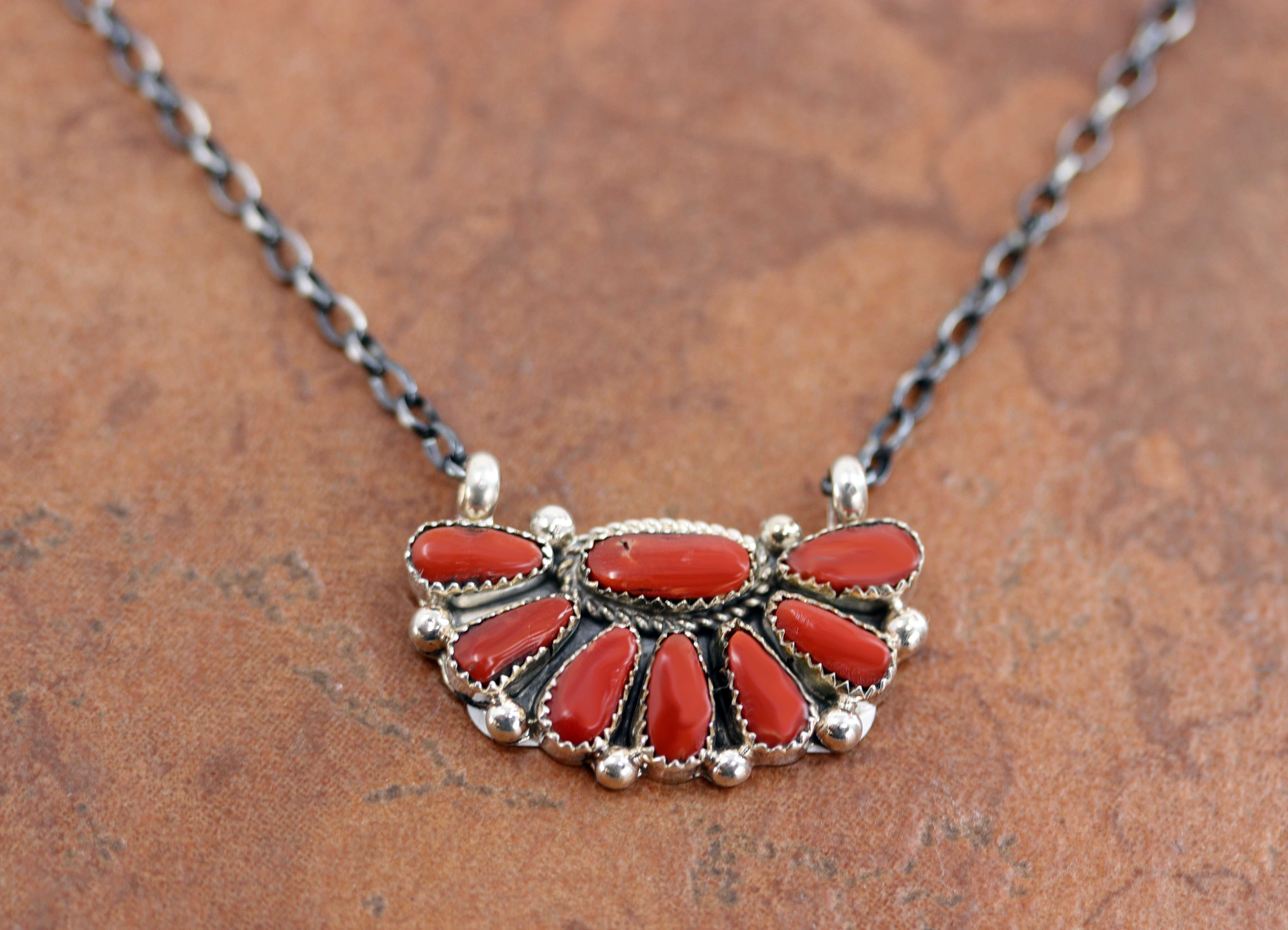 A beautiful Navajo Native American necklace. It is made from sterling silver, and man made coral. The necklace is about 17" in length. The center pendant measures 1 3/8" by 1 1/8".