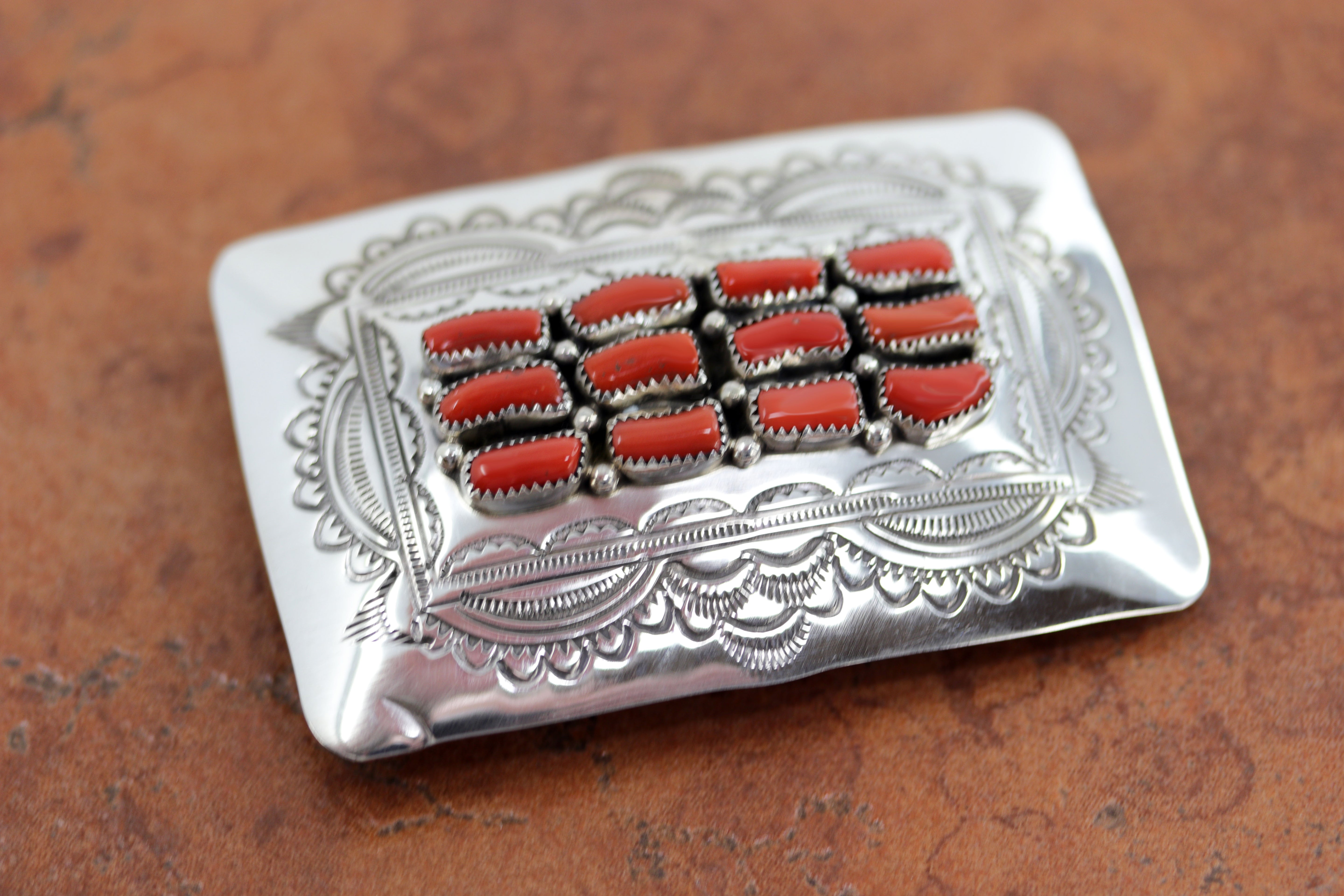 Navajo Silver Coral Belt Buckle