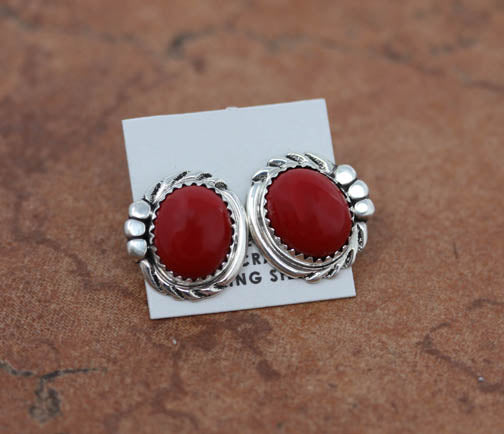 Very nice, Navajo Native American earrings. They are made from sterling silver and coral. The earrings are about 5/8" in length, and about 5/8" wide. They are stamped sterling.