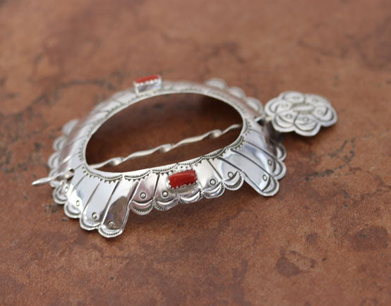 A beautiful Navajo Native American Barrette made from sterling silver and coral. It is 2" long, and about 3" wide. The pin measures 3 7/8" in length.