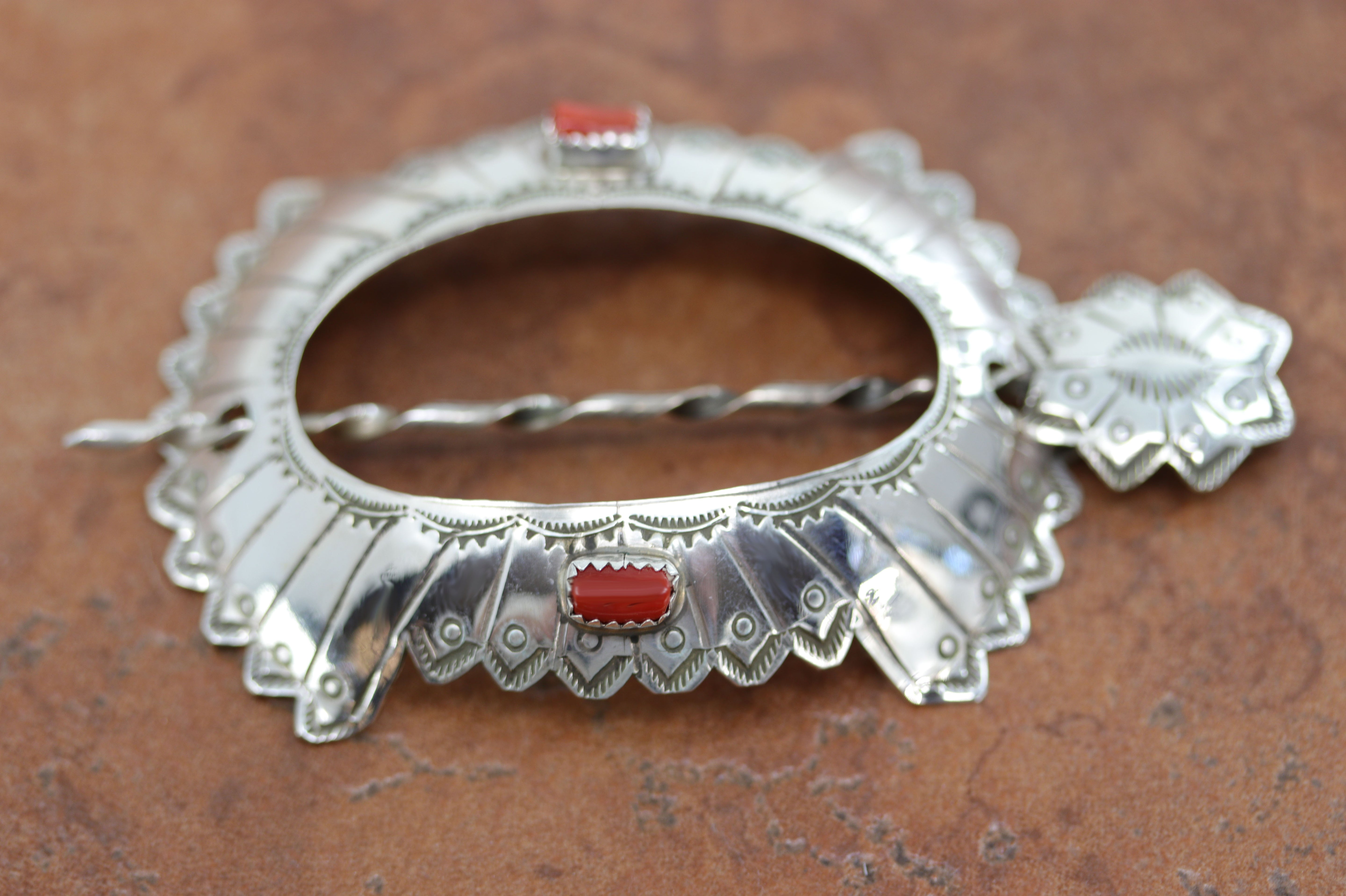 Navajo Native American Barrette made from sterling silver and coral. It is 3" long, and about 2 1/8" wide. The pin measures 3 7/8" in length.