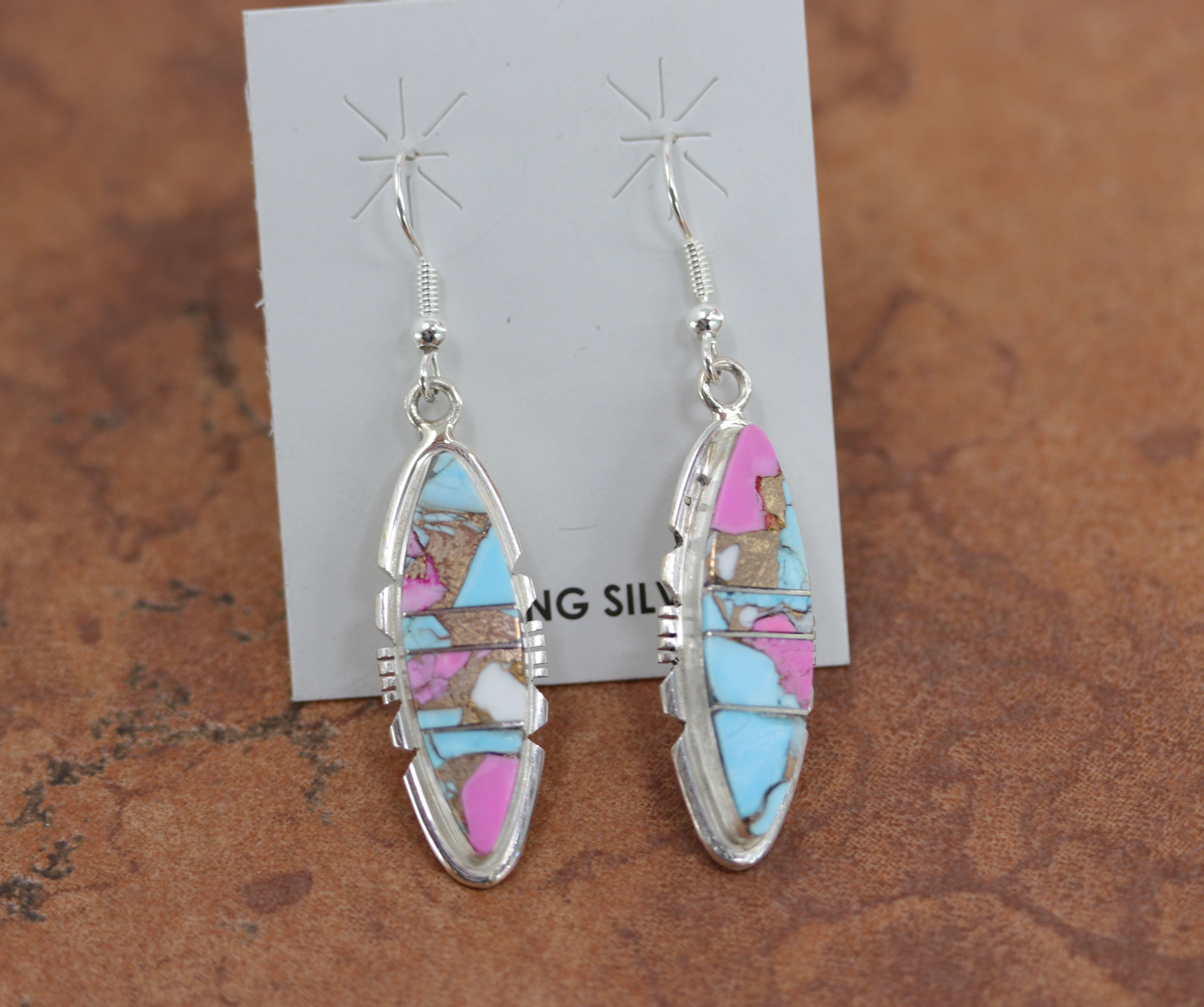 They are made from sterling silver and cotton candy dahlia turquoise. The earrings are about 2 3/16" in length including the hook and 3/4" in width.