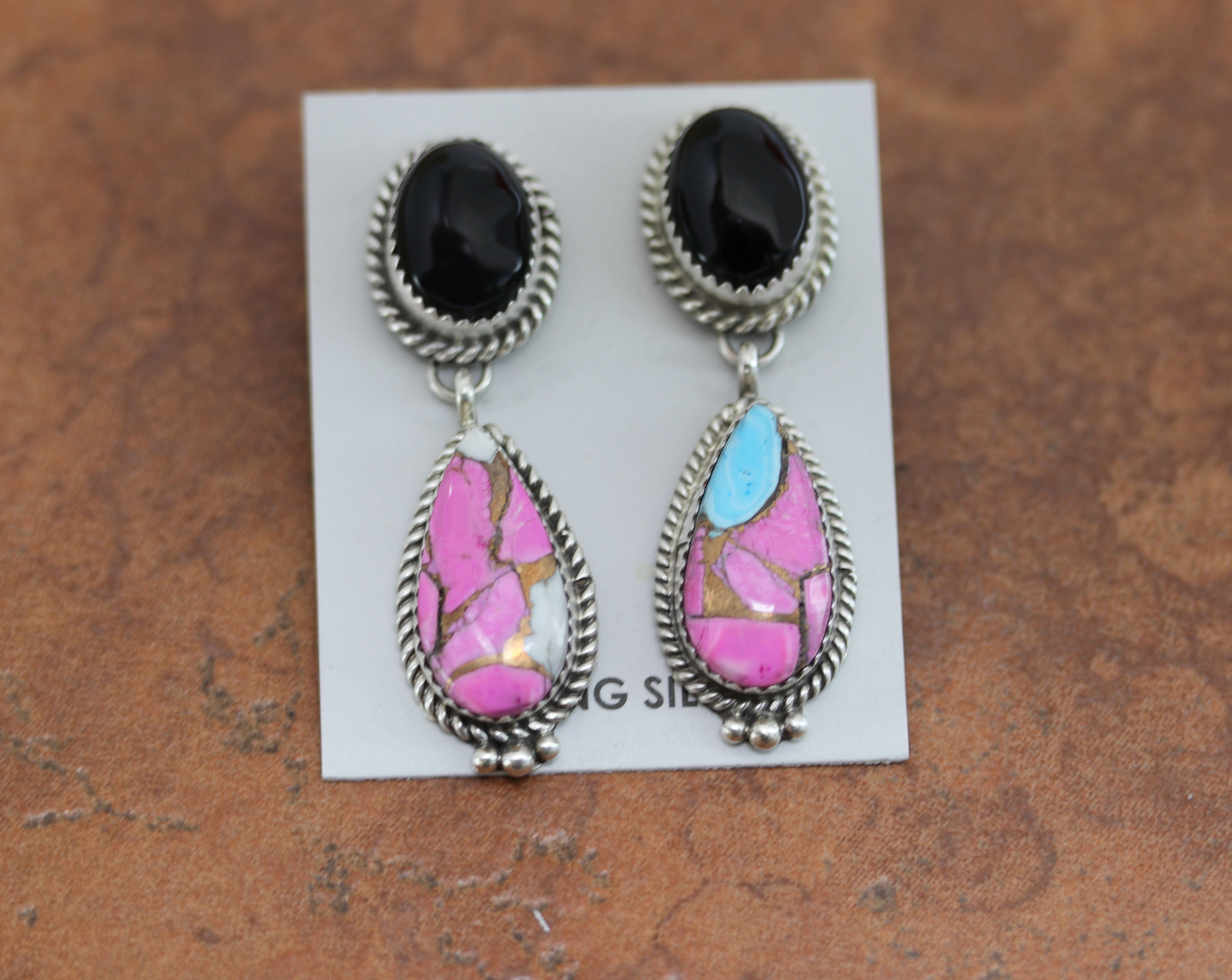 Navajo Silver Cotton Candy Turquoise Onyx Earrings