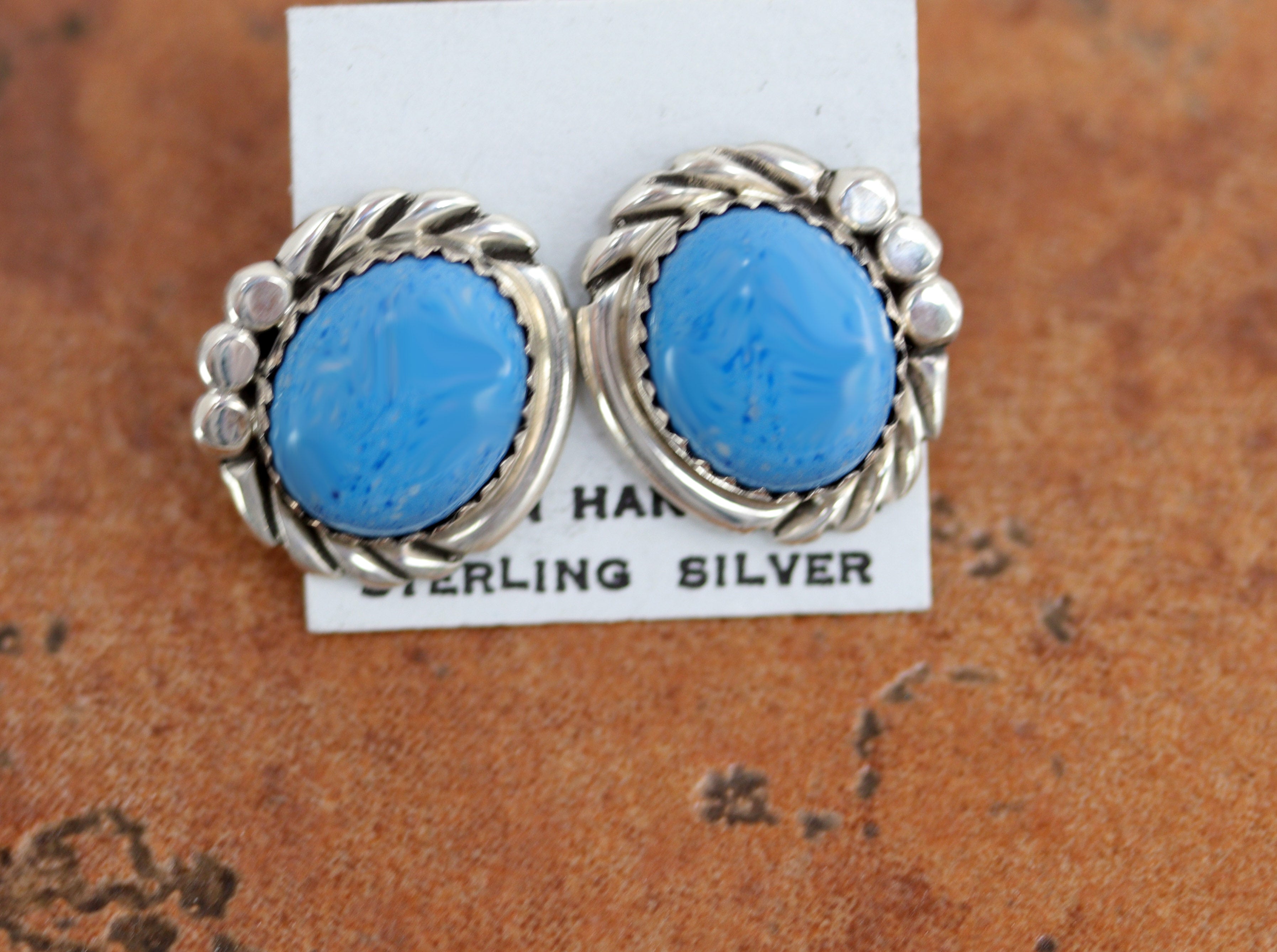 Very nice, Navajo Native American earrings. They are made from sterling silver and denim lapis. The earrings are about 5/8" in length, and about 5/8" wide.