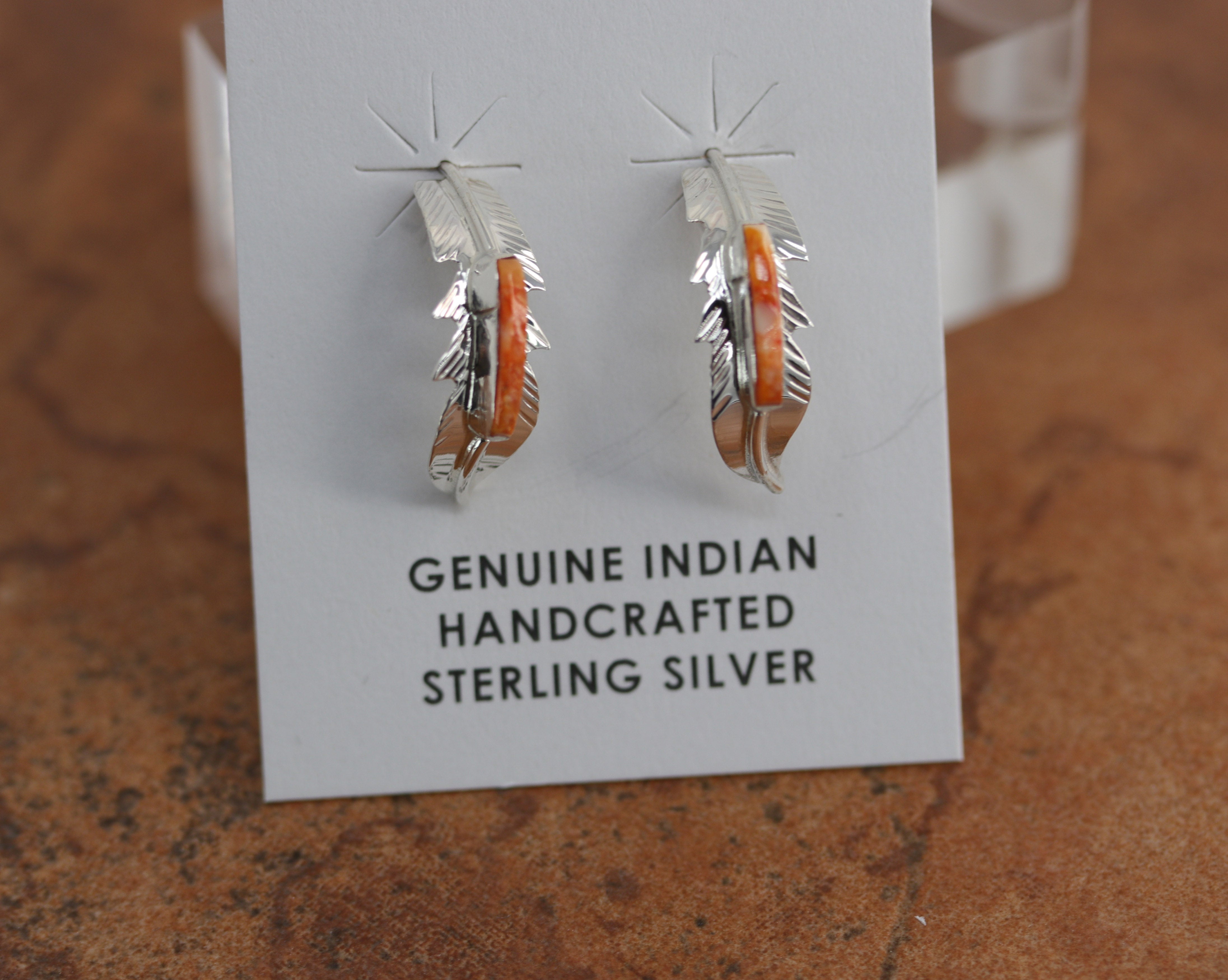 A beautiful pair of Navajo Native American feather earrings. They are made from sterling silver and spiny oyster. The earrings are about 1 1/8" in length, and about 3/8" wide. They are stamped sterling.