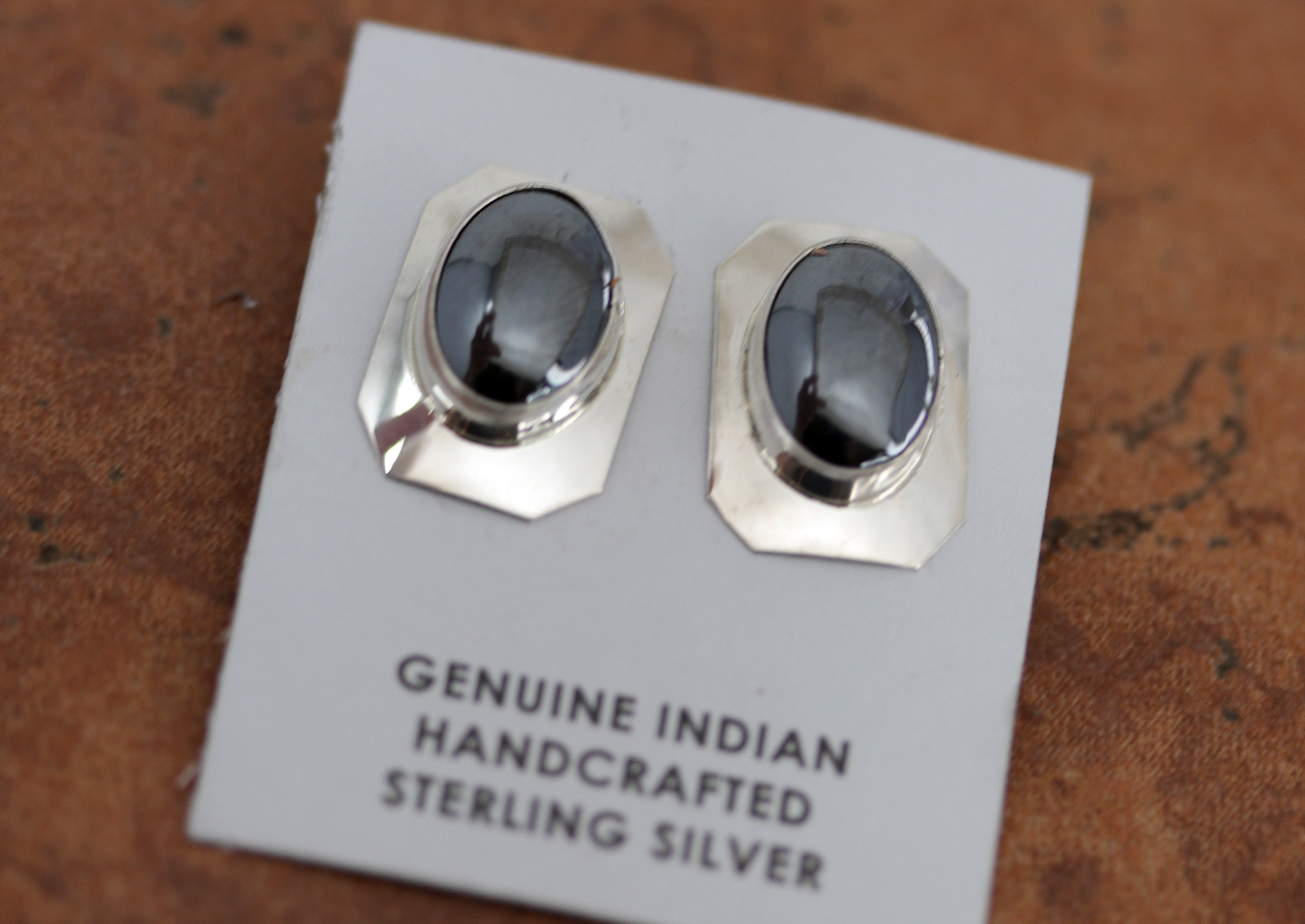 Navajo Native American earrings by N Wilson. They are made from sterling silver and hematite. The earrings are about 1 7/8" in length and 5/8" wide.