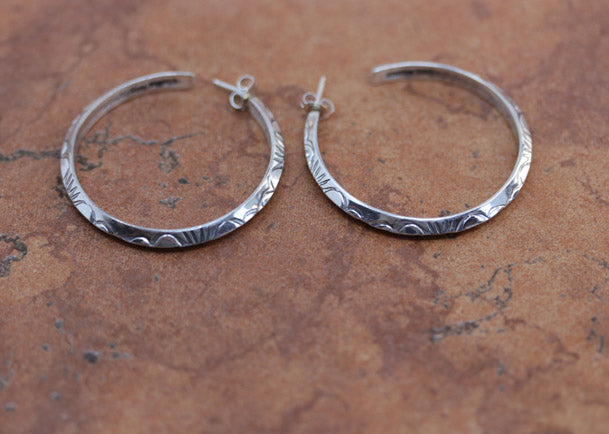 Authentic Navajo Native American earrings. They are made from sterling silver. The earrings are about 1 3/4" in length, and about 3/16" wide. They are stamped Sterling.