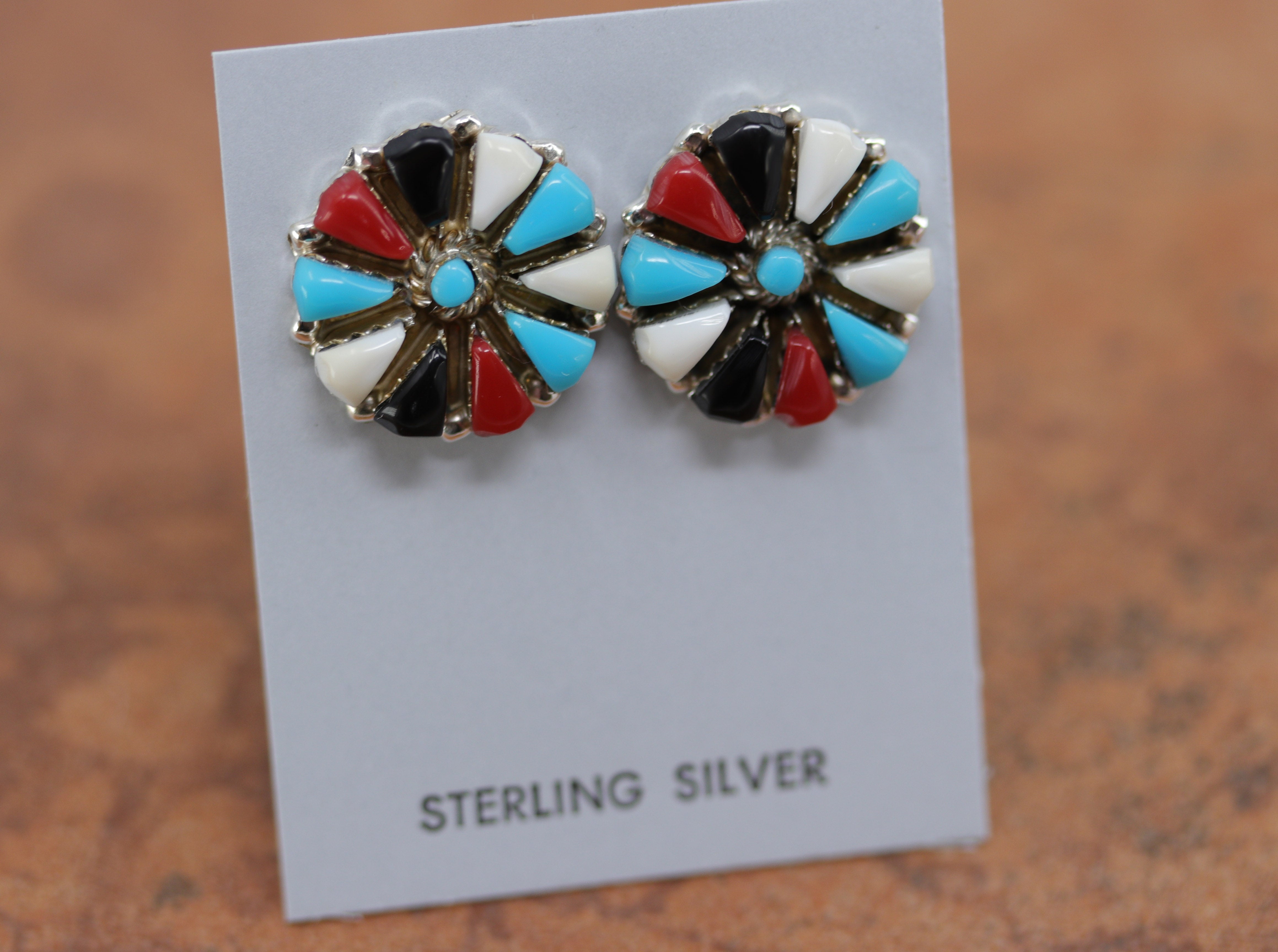Authentic and beautiful Navajo Native American cluster earrings. They are made from sterling silver and man made stones. The earrings are about 7/8" in diameter.