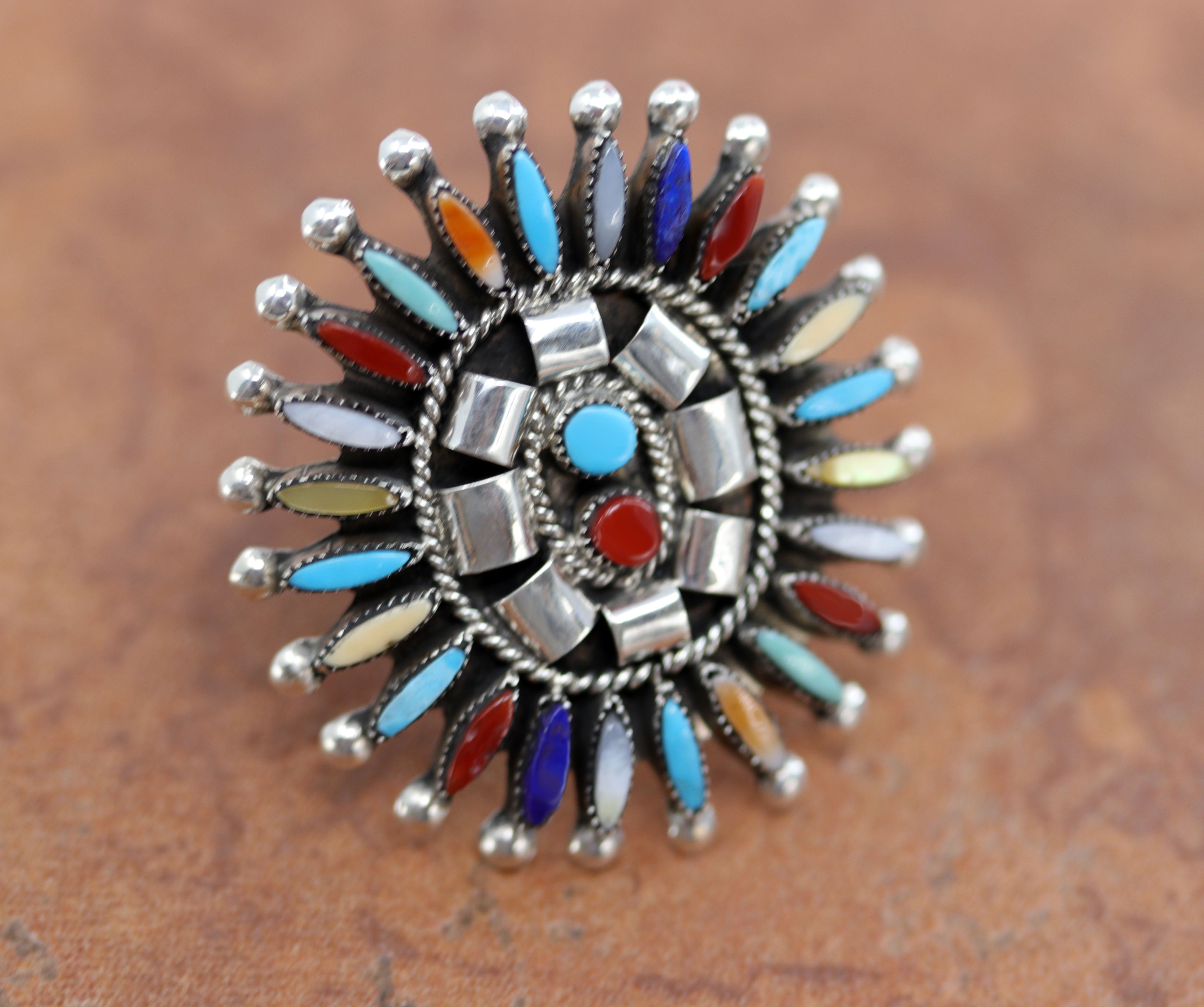 A lovely Zuni Native American ring. It is made from sterling silver and various stones. The ring size 7 and it is 1 5/8" in length.