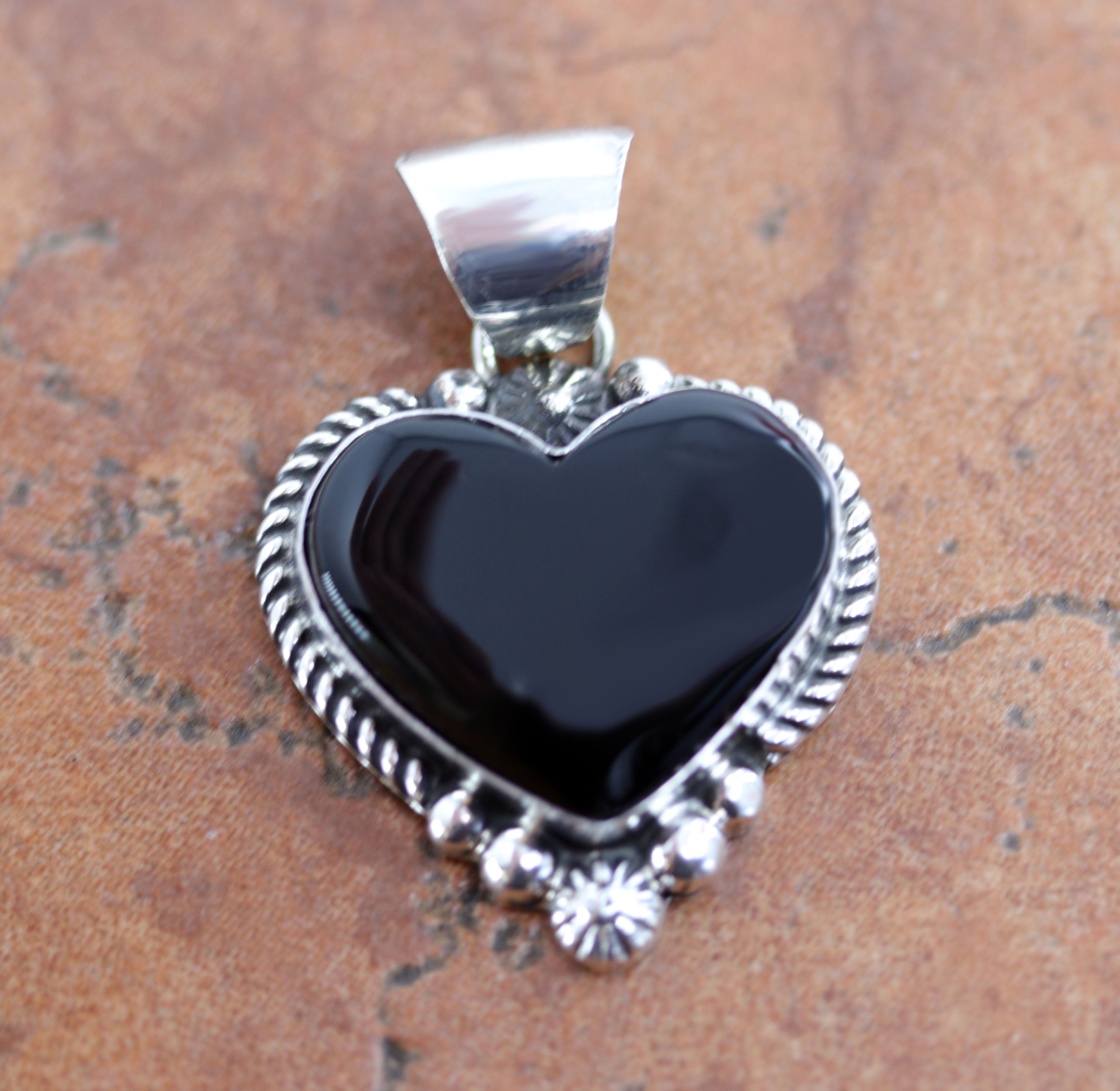 A beautiful Navajo Native American pendant. It is made from sterling silver and onyx. The pendant is about 1 7/8" in length and 1 1/4" in width.
