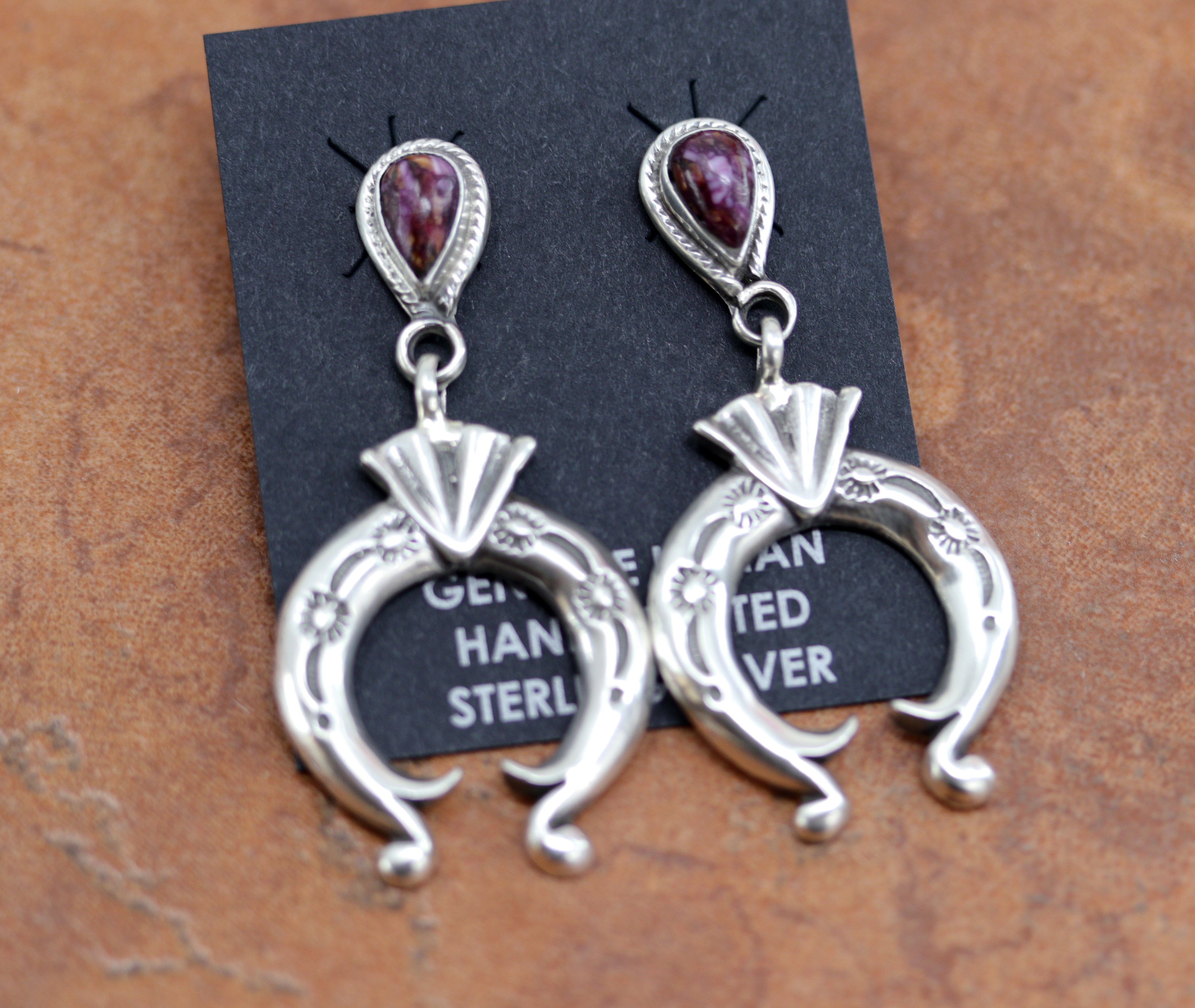 Beautiful Navajo Native American earrings. They are made from sterling silver and spiny oyster. The earrings are about 2" in length, and 1" in width.