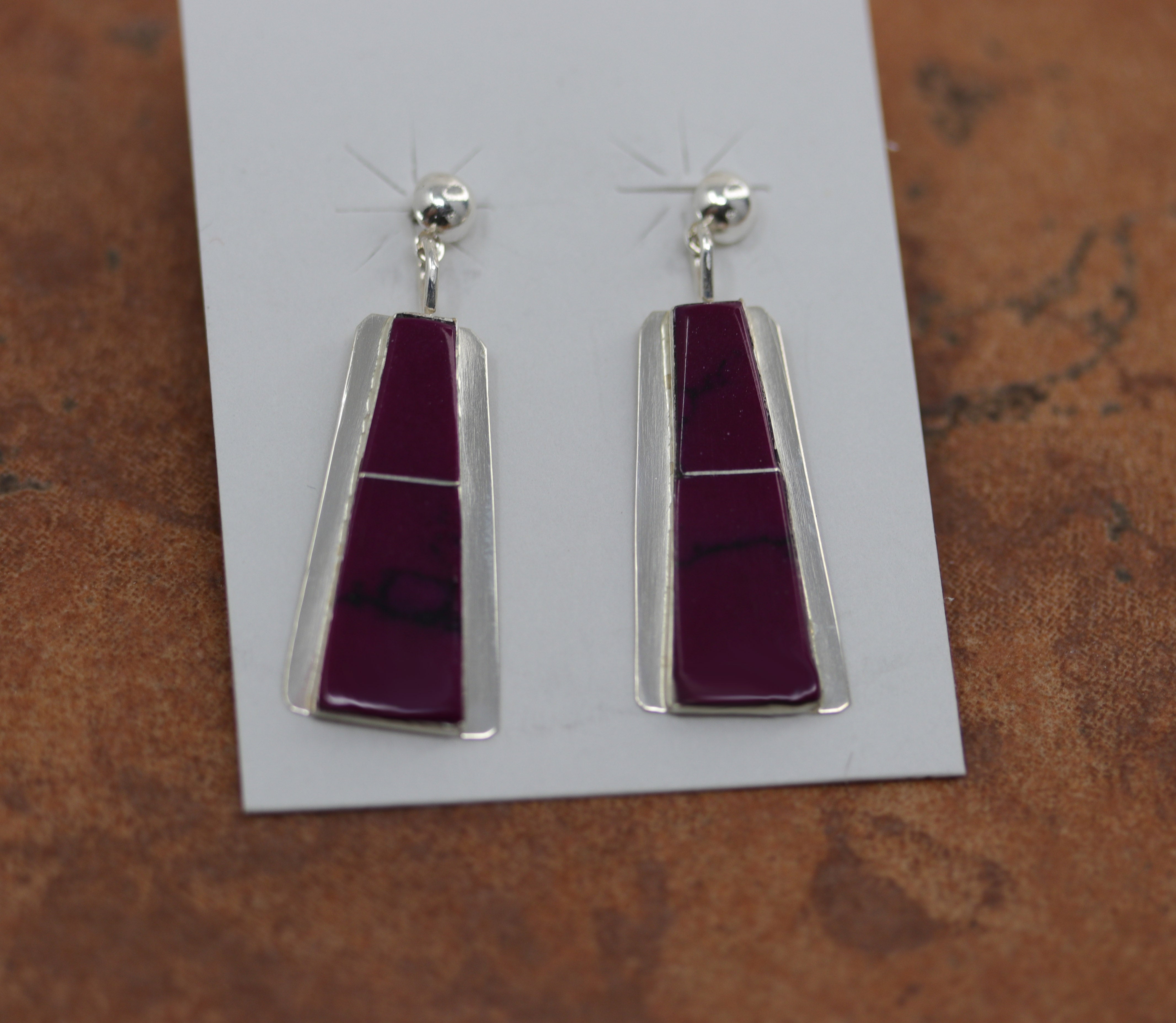Navajo Native American earrings by Brenda Pete. They are made from sterling silver and sugilite. The earrings are about 1 3/8" in length, and 1/2" in width.