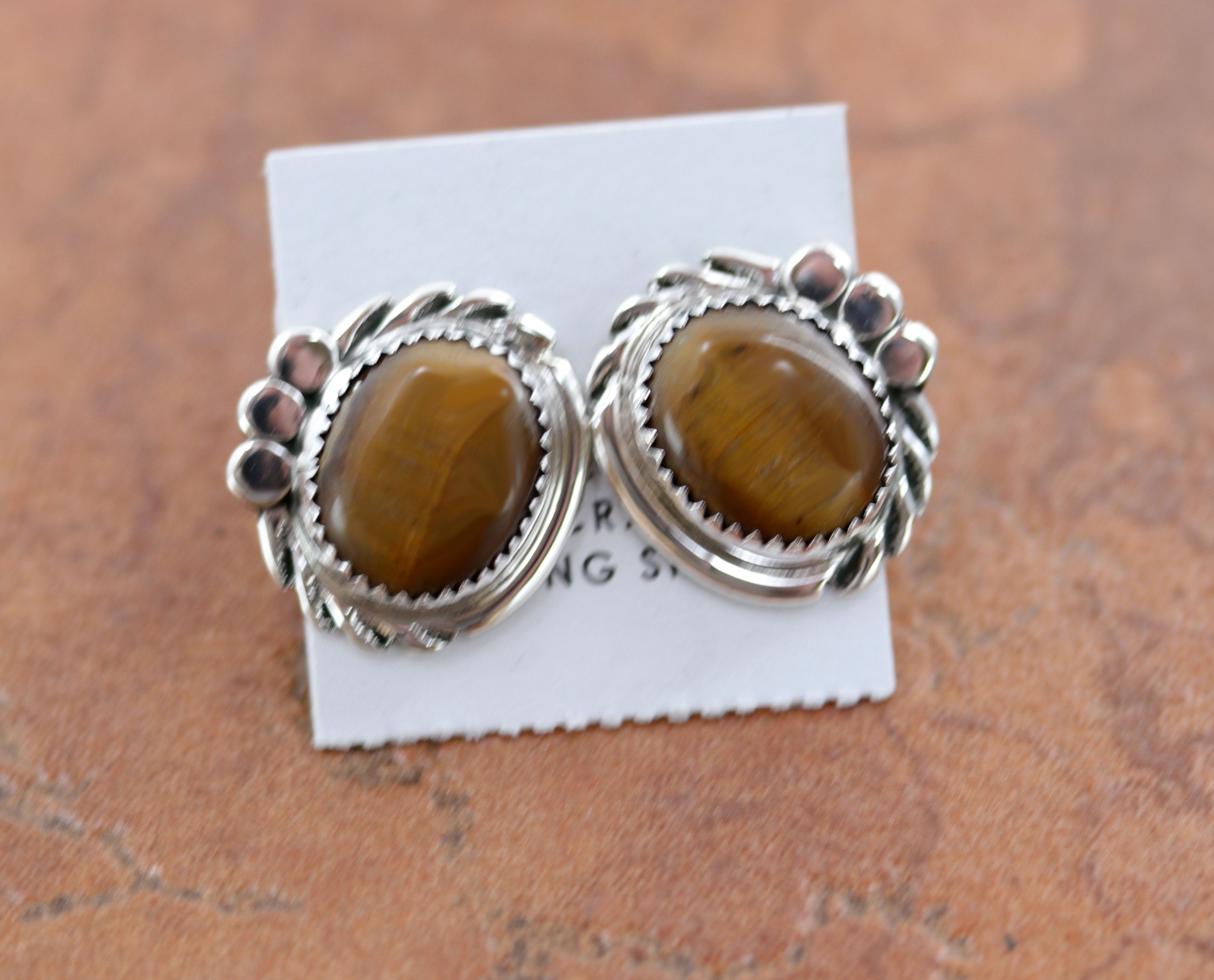 Very nice, Navajo Native American earrings. They are made from sterling silver and tiger eye. The earrings are about 5/8" in length, and about 5/8" wide. They are stamped sterling.
