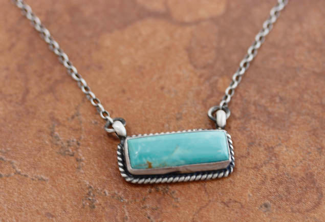 A beautiful Navajo Native American necklace. It is made from sterling silver, and turquoise. The necklace is about 17" in length. The center pendant measures 1 1/8" by 1/2". Please allow a slight difference in the stone matrix.