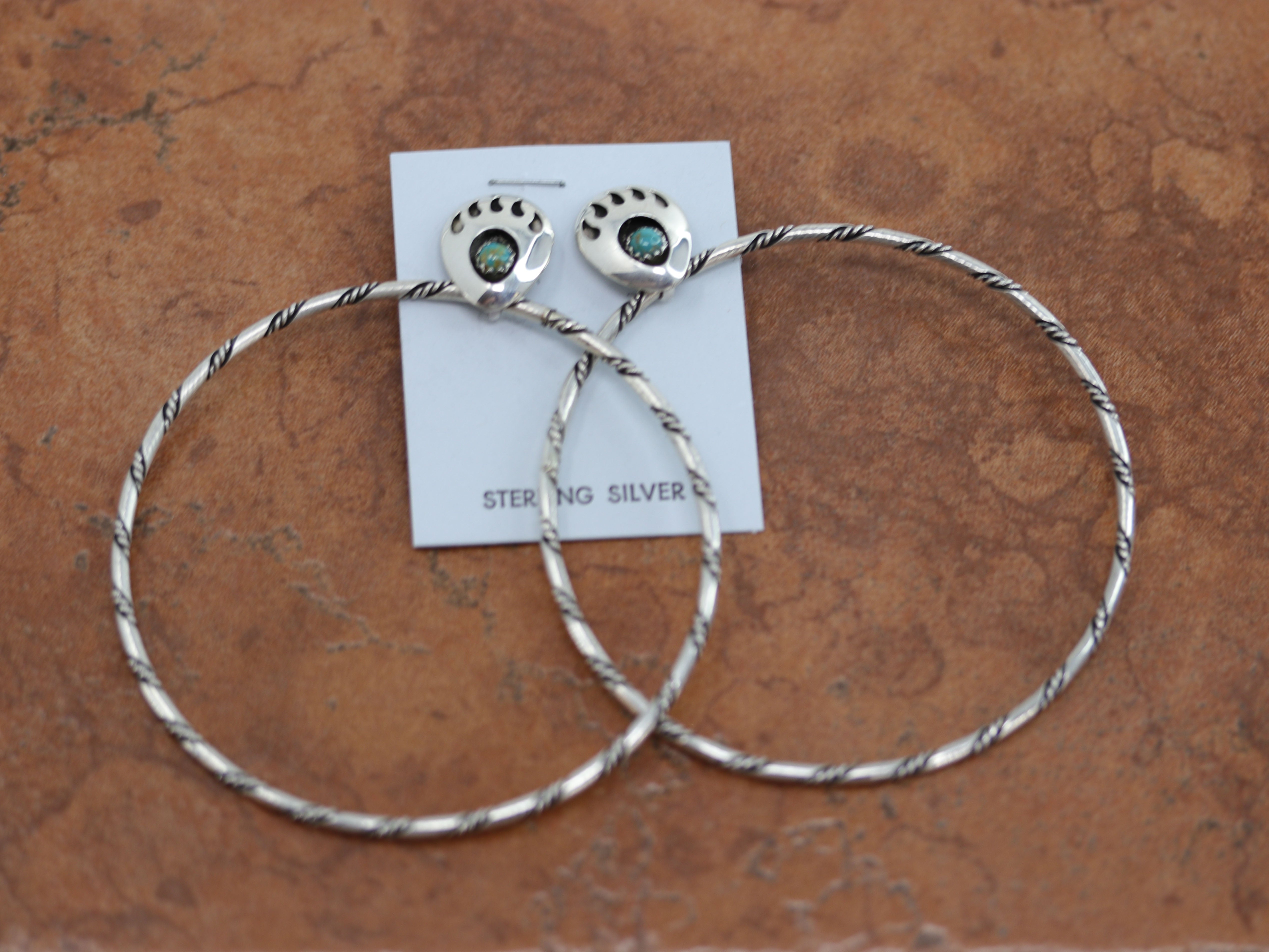 Navajo Silver Turquoise Bear Paw Hoop Wire Earrings