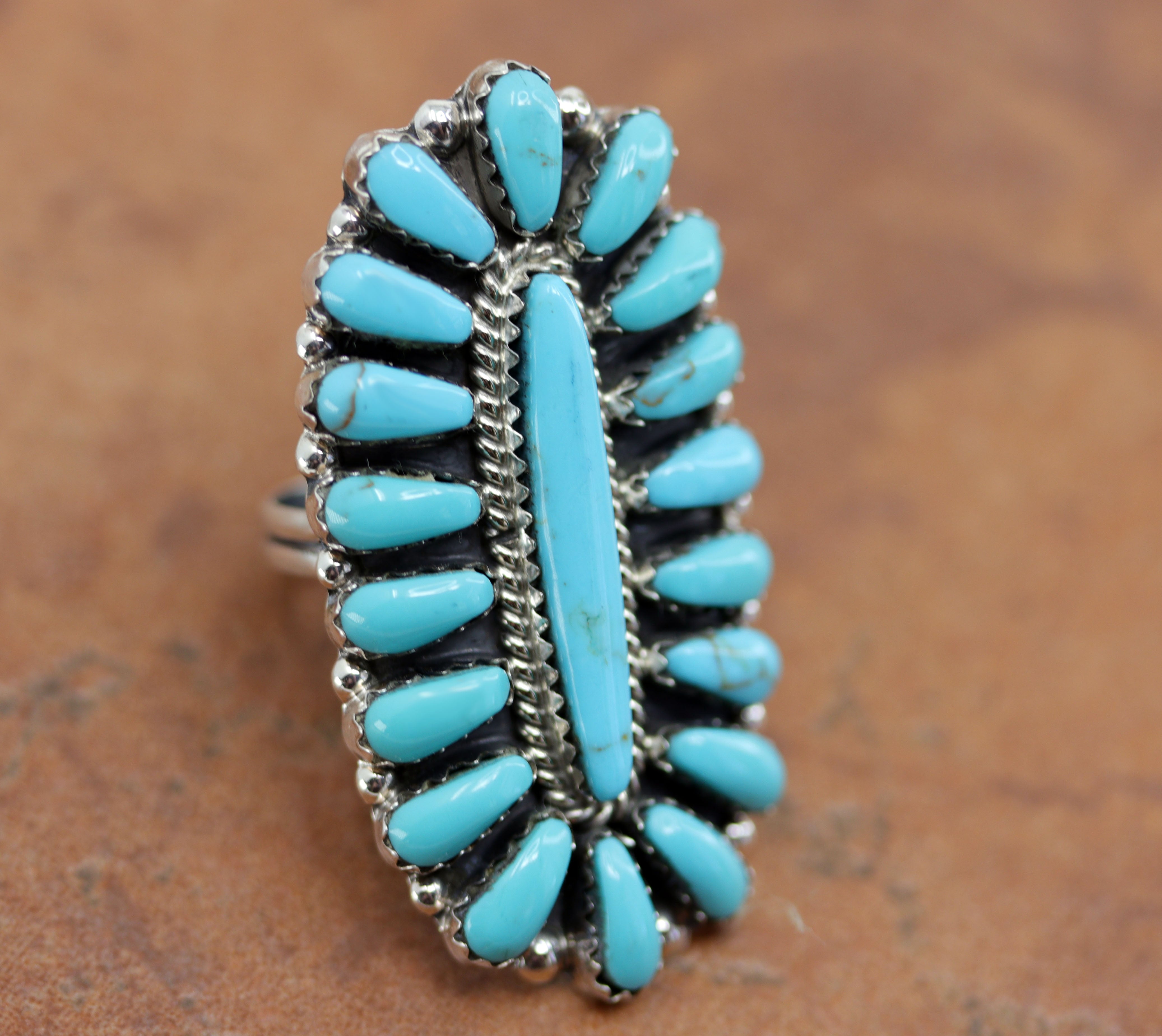 A lovely Navajo Native American ring. It is made from sterling silver and man made turquoise. The ring size 7 1/2 and it is 1 7/8" in length.